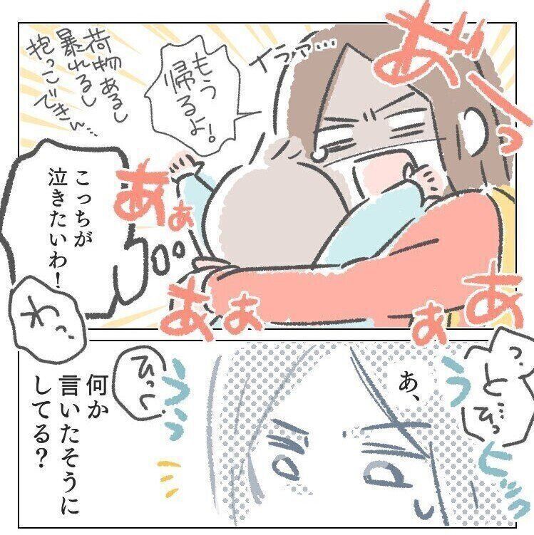 止まらないギャン泣きに(こっちが泣きたいわ!)とにいどゆうさんは困り果てます。その一方で、ふとした瞬間、あーくんが何かを言いたそうにしていることにも気づきました。