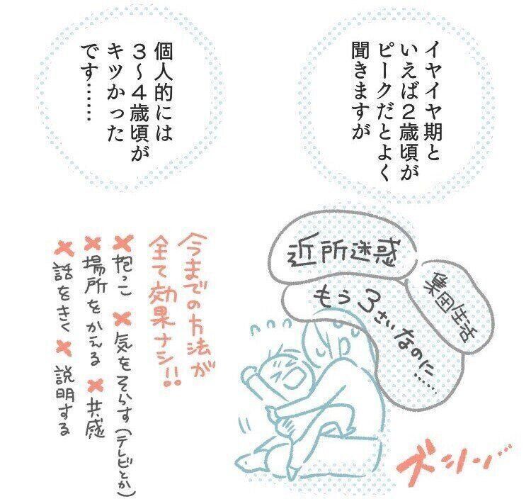 小さいときに使えていた対処法に効果がなくなる上、にいどゆうさんには「近所迷惑」や今後おとずれる「集団生活」ができるのか、「もう3歳なのに」といったプレッシャーものしかかっていました。