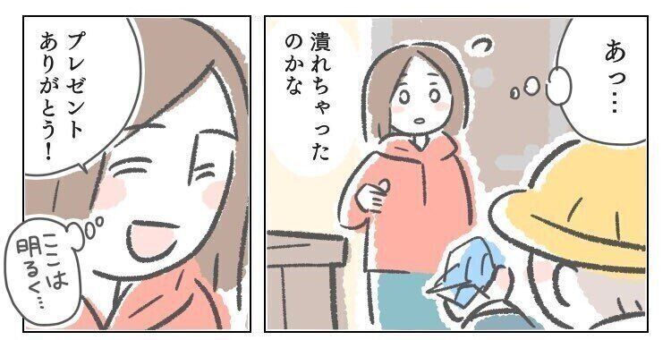 (もしかして潰れちゃったのかな)と状況を察し、あーくんを落ち込ませないように明るく「プレゼントありがとう!」と声を掛けました。