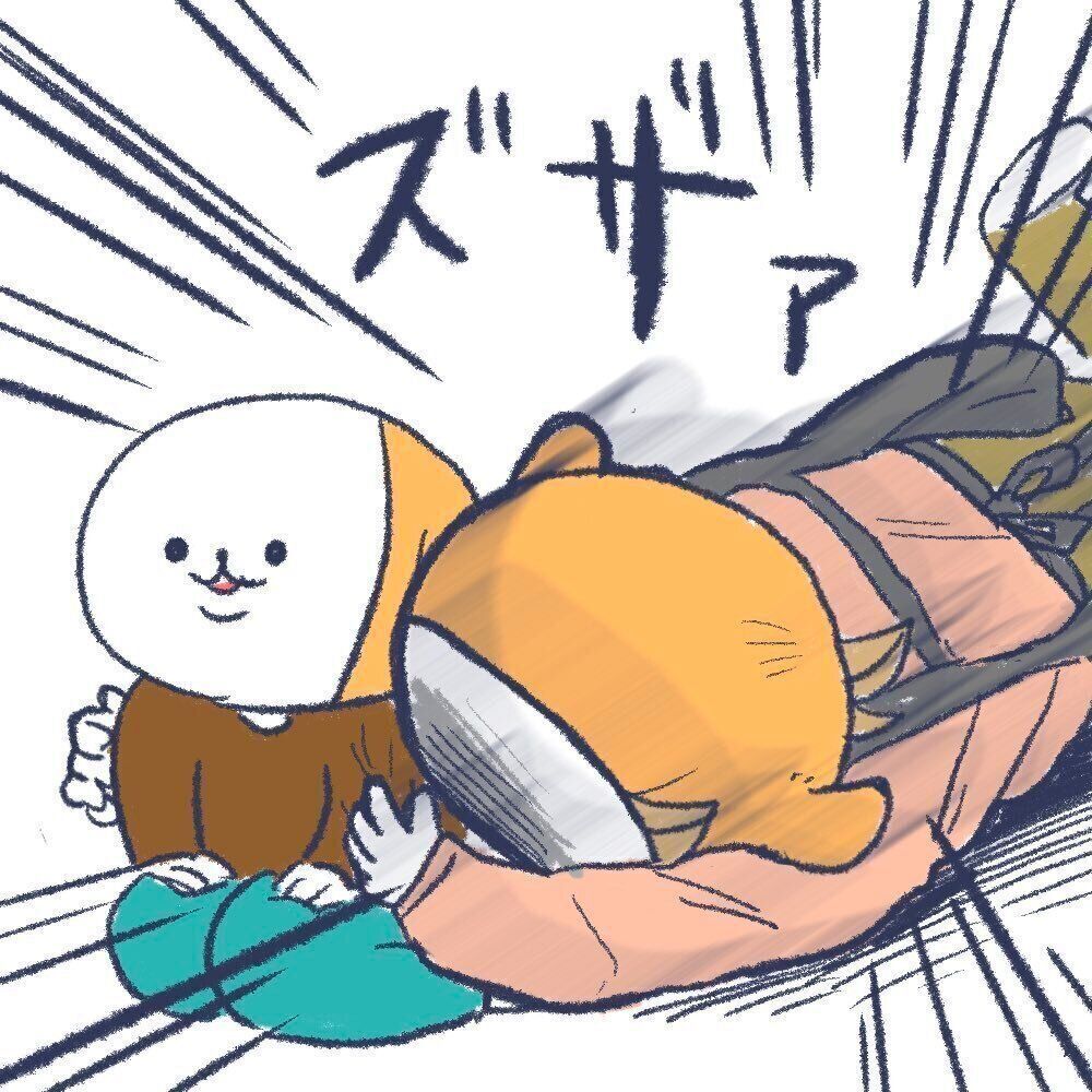 ズザァ!と、こうどんくんの背中にスライディングで抱きつきます!
