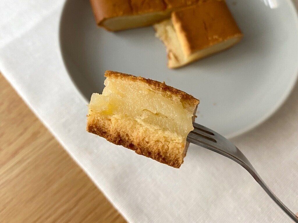 焼き上がりはフィナンシェのような、焼菓子のよい香りが漂います。包丁でカットしてみると表面はガリガリと音を立てる程かたく、中心部は生地が包丁にまとわりつく程もっちり。