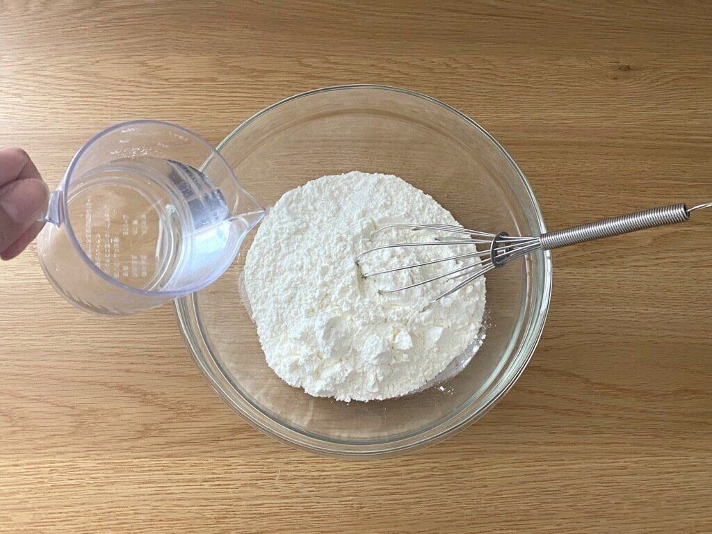 ボウルに水90mlとミックス粉を入れて泡だて器で混ぜ合わせる。