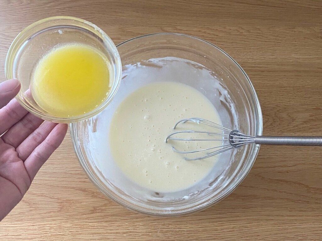 溶かしバター35gを入れ、なめらかになるまで混ぜ合わせる。