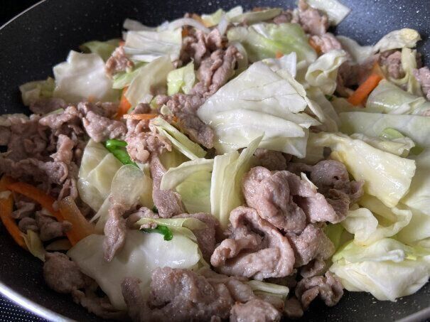 フライパンにごま油をひいて、カットした豚肉と野菜を炒めます。他にももやしやニラ、海老などお好みの具材で作ることができます。