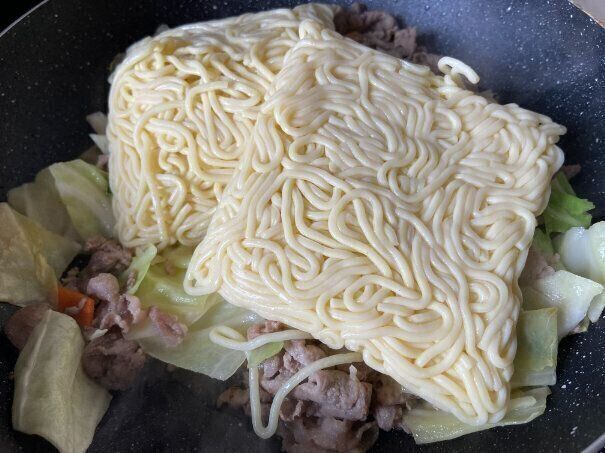 麺をフライパンに入れて、少量の水を麺の上からまわしかけてフタをして2分ほど蒸し焼きに。