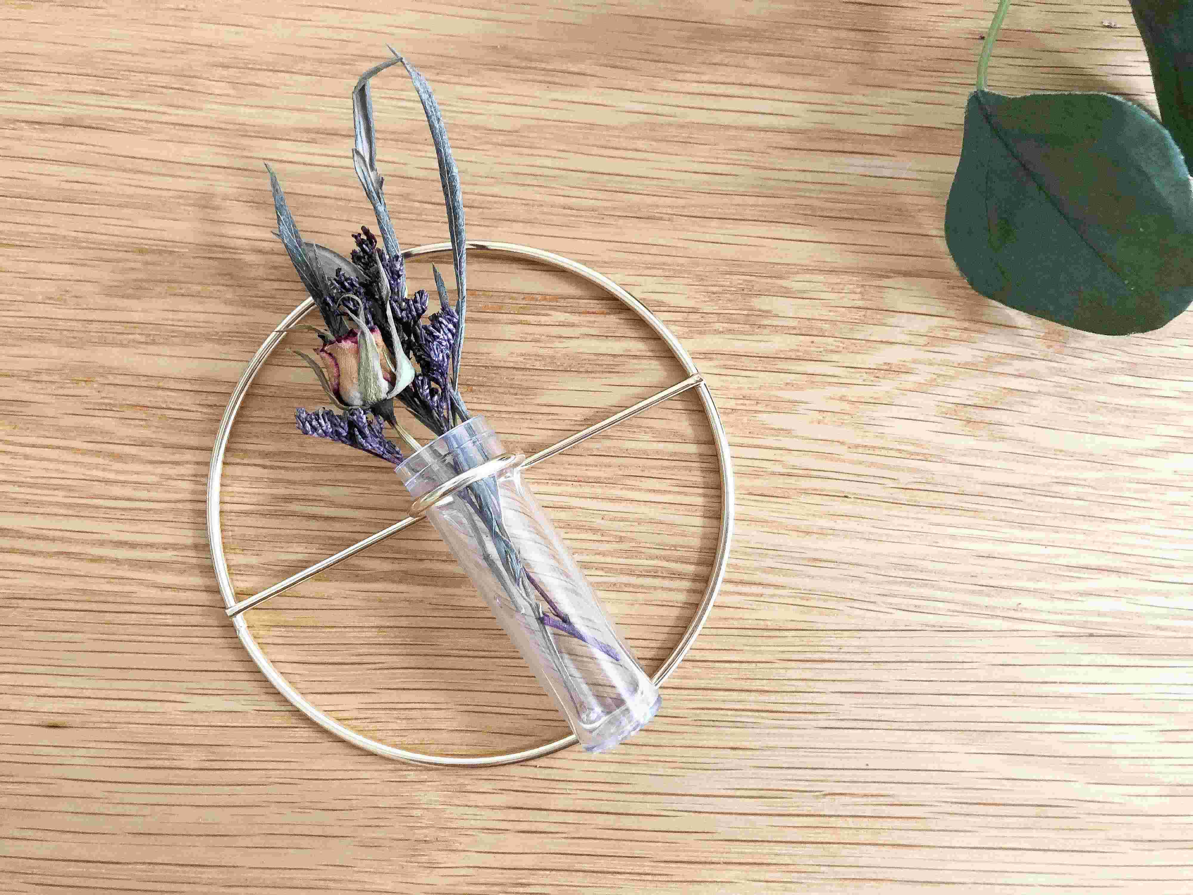 飾り方は、試験管のような花瓶にお花を生けて、お手持ちのピンで壁に飾るだけでOKです。