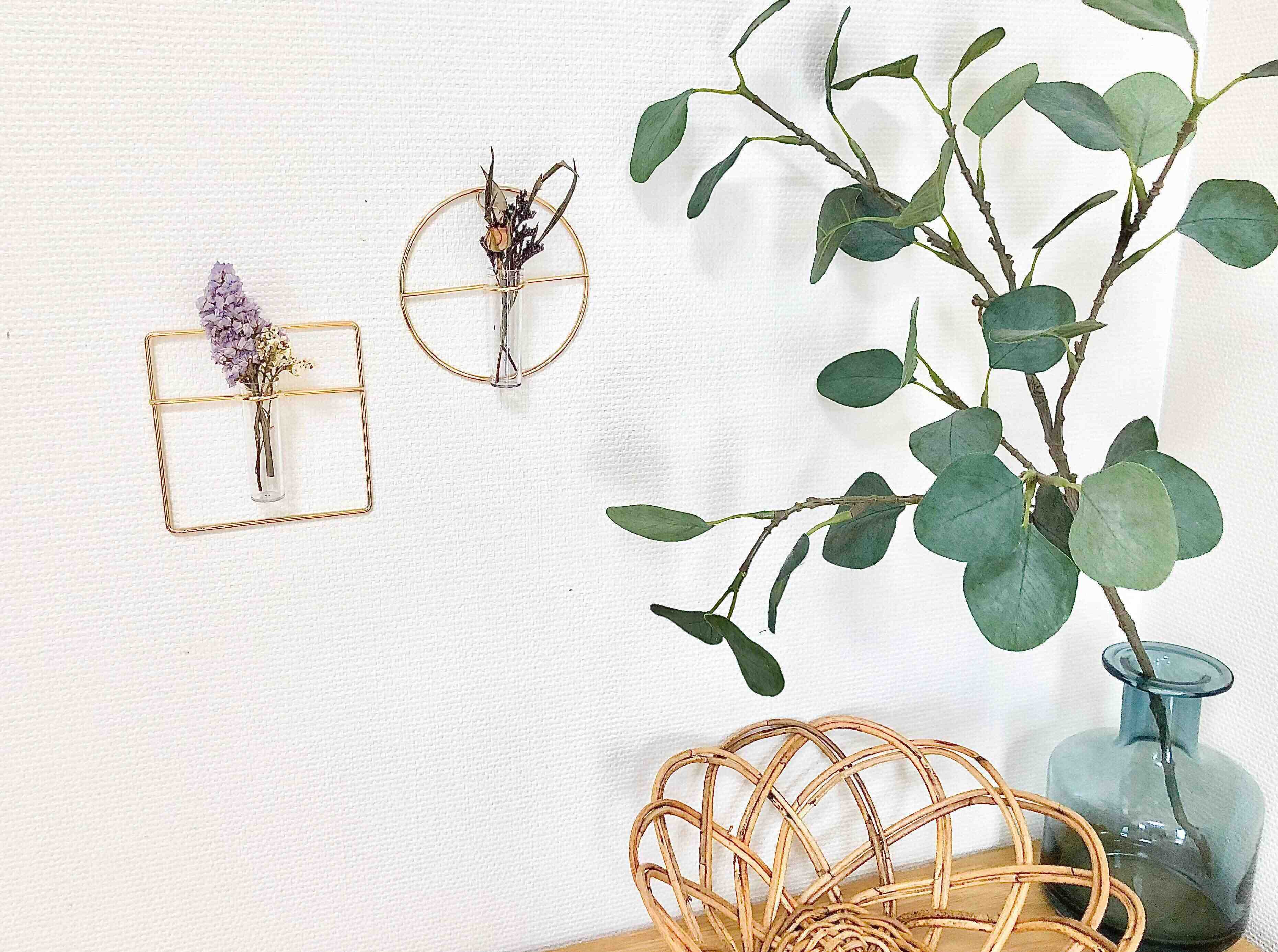壁に掛けて飾るタイプの花瓶で、ゴールドのワイヤーと試験管のような花瓶の組み合わせがすごくおしゃれですよね!