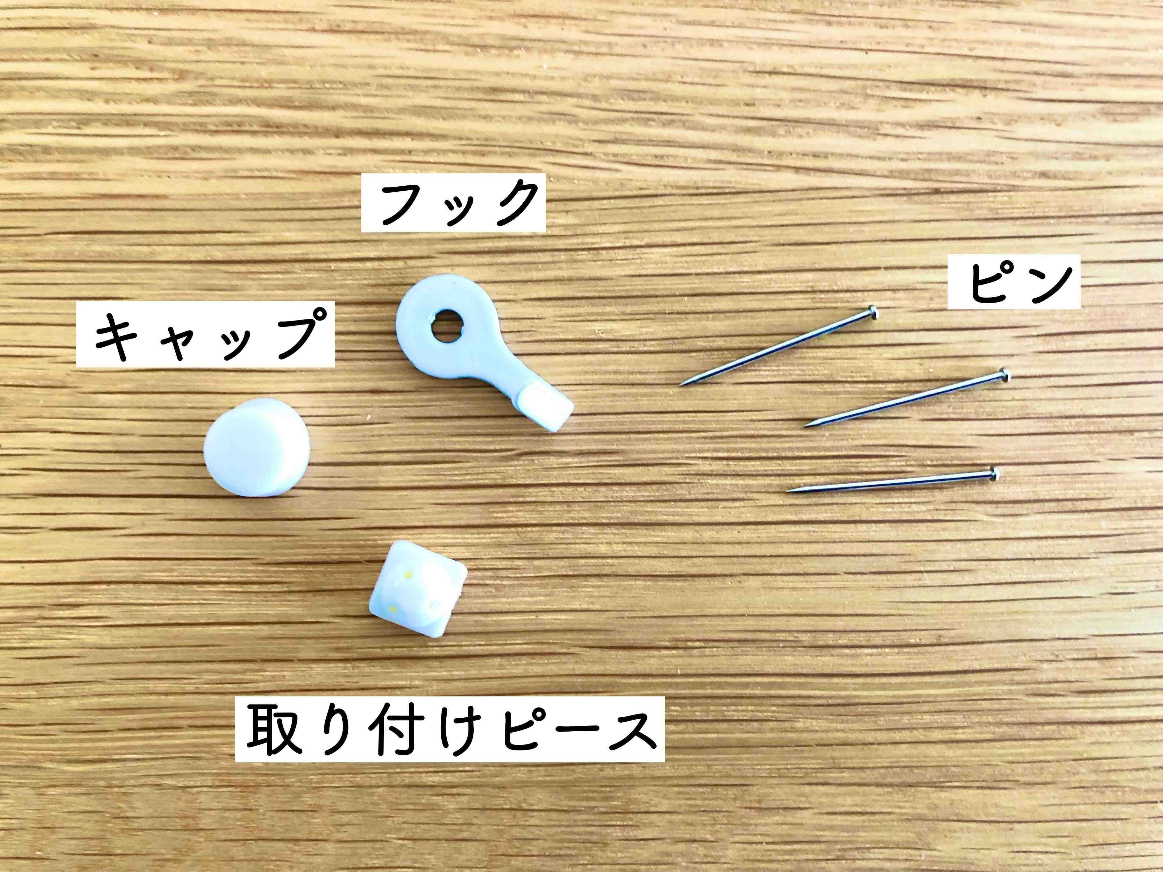 取りつけには、フックと取りつけピース、ピン、キャップの4つのパーツを使用します。