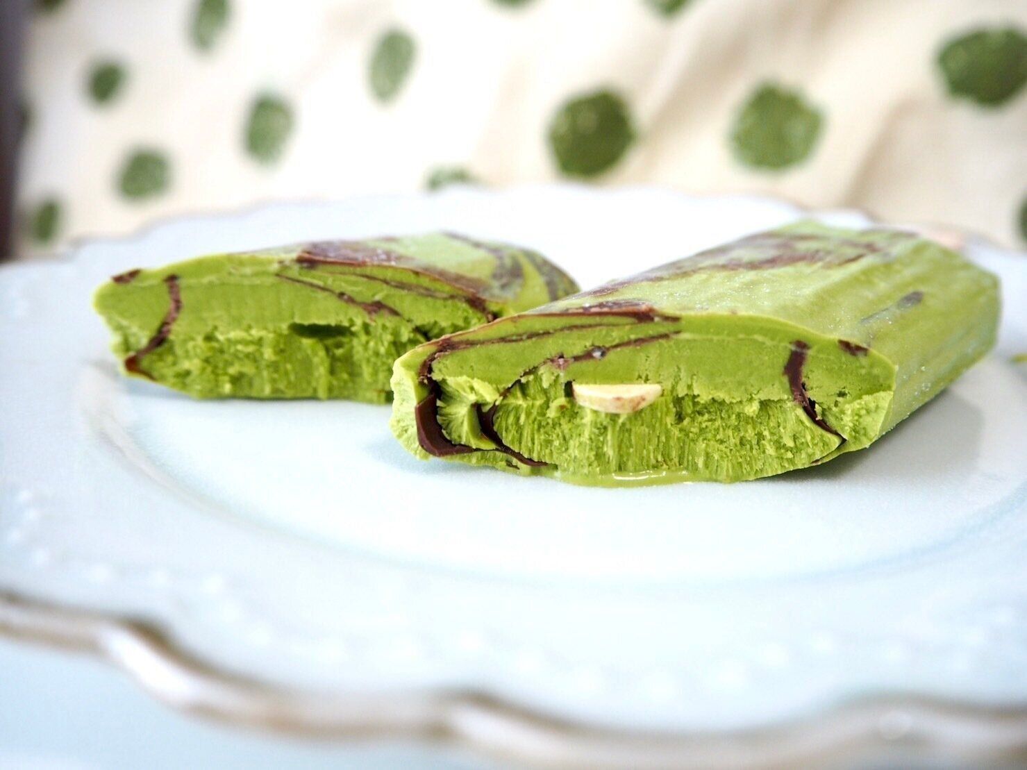 アイスのボディは渋い緑色で、表面を見るとスイートチョコがランダムに入っているのが分かります。