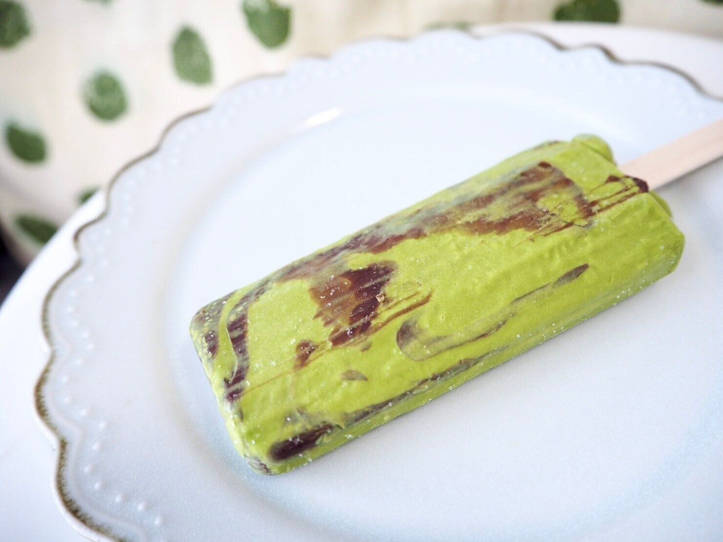 宇治抹茶を使用した濃厚抹茶アイスに、ザラメ入りスイートチョコを加えたバータイプのアイス。