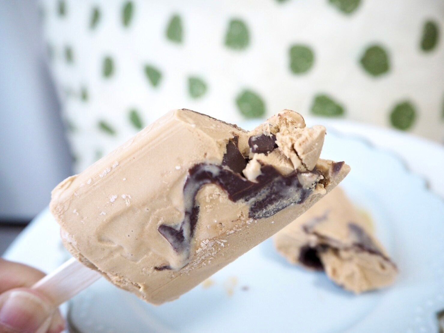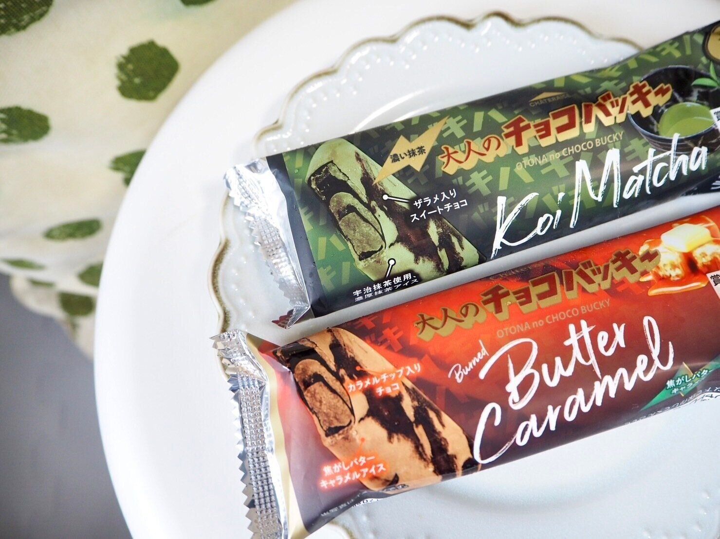 アイス部分は焦がしバターキャラメルとローストキャラメルの、2種類のキャラメルから構成されており、その中にカラメルチップ入りのチョコレートが入っている、濃い抹茶と同様にバータイプのアイスです。