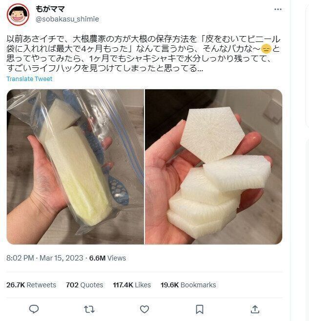 とあるテレビ番組で放送された「大根の保存方法」をツイートすると、たちまち11.7万いいねが集まり大反響をよんでいます。