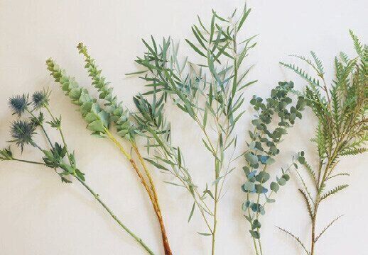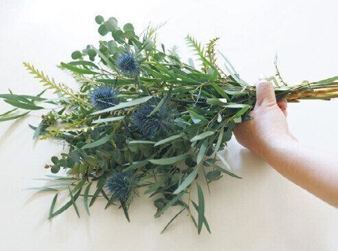 ドライフラワーになりやすい緑を選びましょう。今回はエリンジウムの花も混ぜ、5種類を計7本使用。葉の形がそれぞれ違うのがポイント。