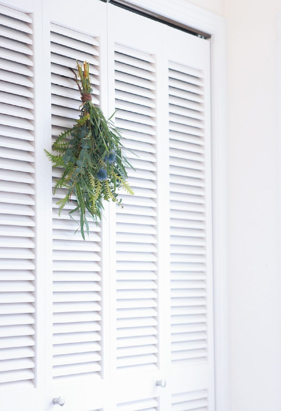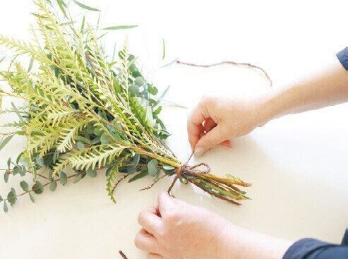 スワッグとは、花や葉を束ねた「壁飾り」のこと。リースより簡単に作れて、飾ったままドライフラワーにもできるから長く楽しめます。ポイントは花材選び。ドライフラワーになりやすい緑の葉ものから、葉の形が違うタイプを数種類組み合わせて。