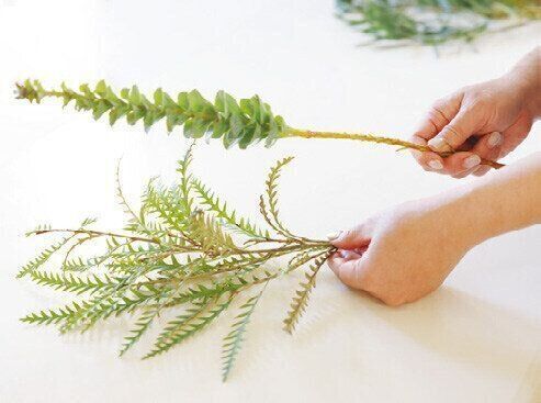 枝が分かれているものは、それぞれ長さが揃うように切り分けます。参考までに今回のスワッグは、いちばん長く使ったグレビレアが約40cm、短く使ったエリンジウムがその半分強でした。