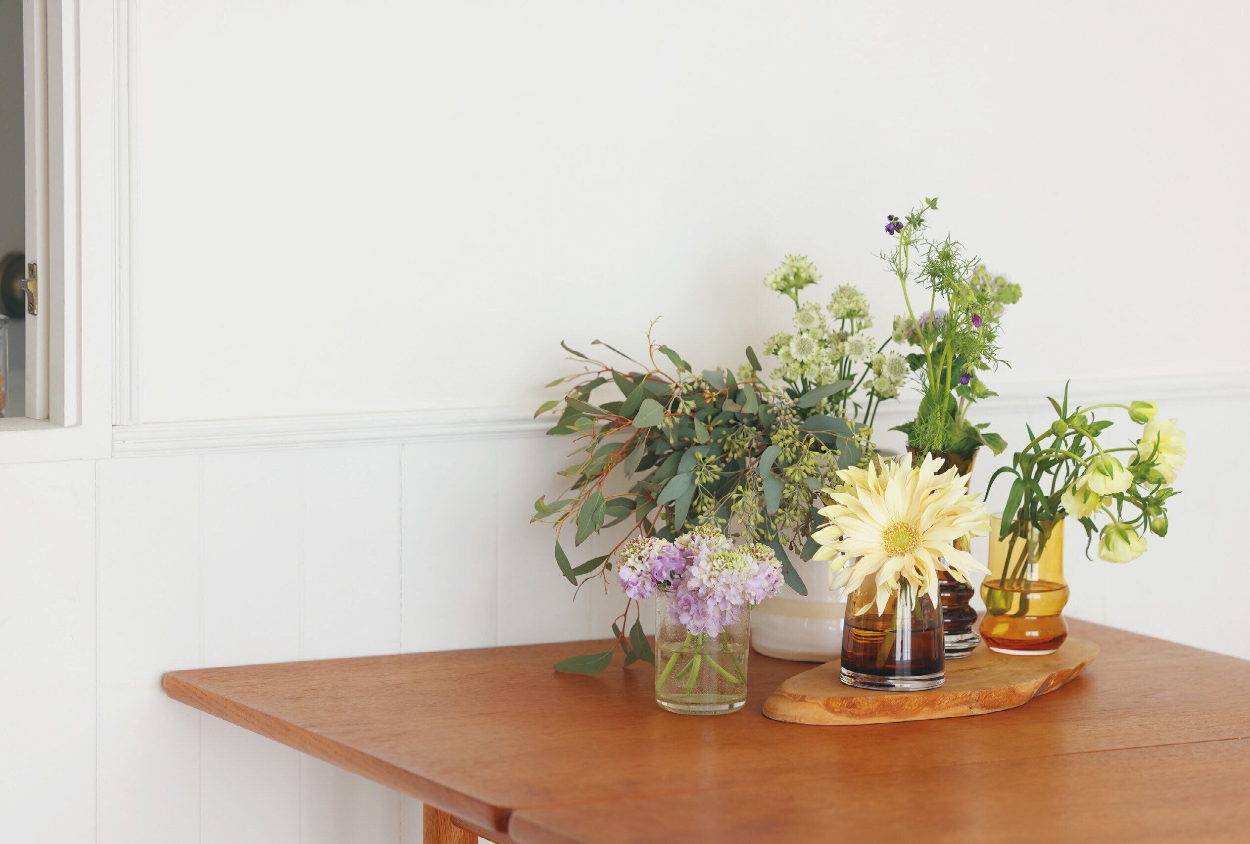 花束をもらったとき、大きな花びんに飾るのはもちろん素敵。でも、ちょうどいい花びんがない場合は、コップなどに種類別に分けると簡単にかわいくまとまります。あちこちに置いてもいいし、トレーにいくつか並べるだけで、目を引くコーナーに!