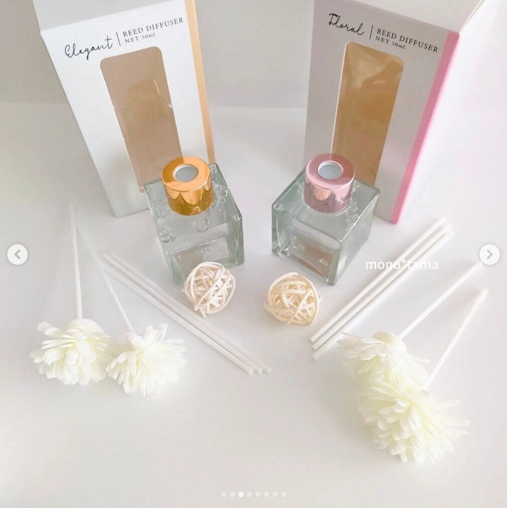セリアでは、こんなにかわいいアロマディフューザーが買えちゃいます!価格はもちろん110円。内容量は約50mlのコンパクトサイズですが、お花やラタンボールまでついていてとても華やかです。香りはフローラル、エレガント、ジャスミンの3種類です。