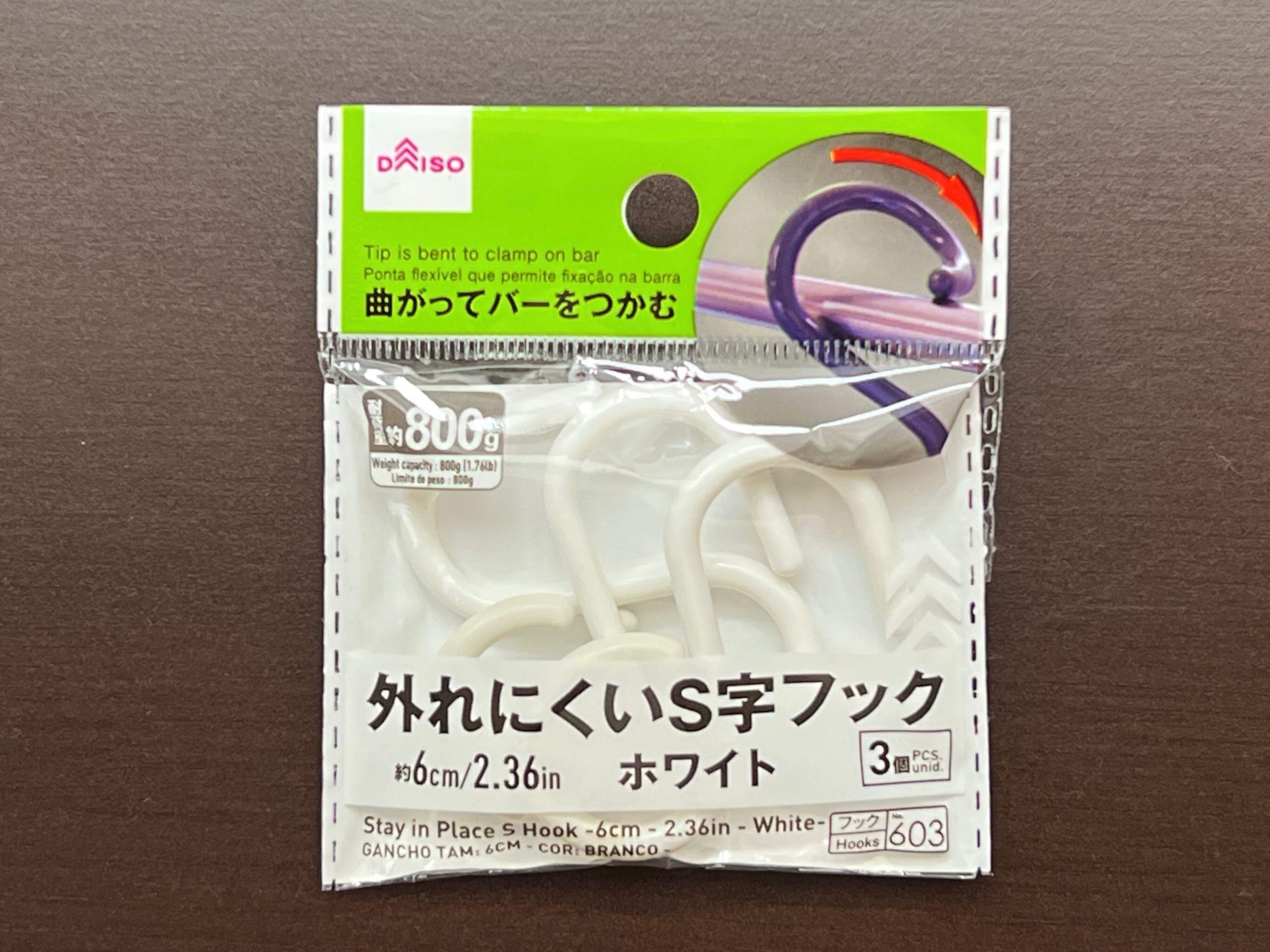 今回ご紹介するのはダイソーの「外れにくいS字フック」。商品名のとおり、バーにかけたときに外れにくいのが特徴となっています。