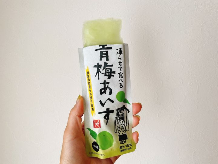「梅あいす」と「青梅あいす」どちらも128円で、常温で販売されているので、冷凍庫で凍らせてから食べます(店舗によってはすぐに食べられるように冷凍庫に陳列されている場合もあります)。