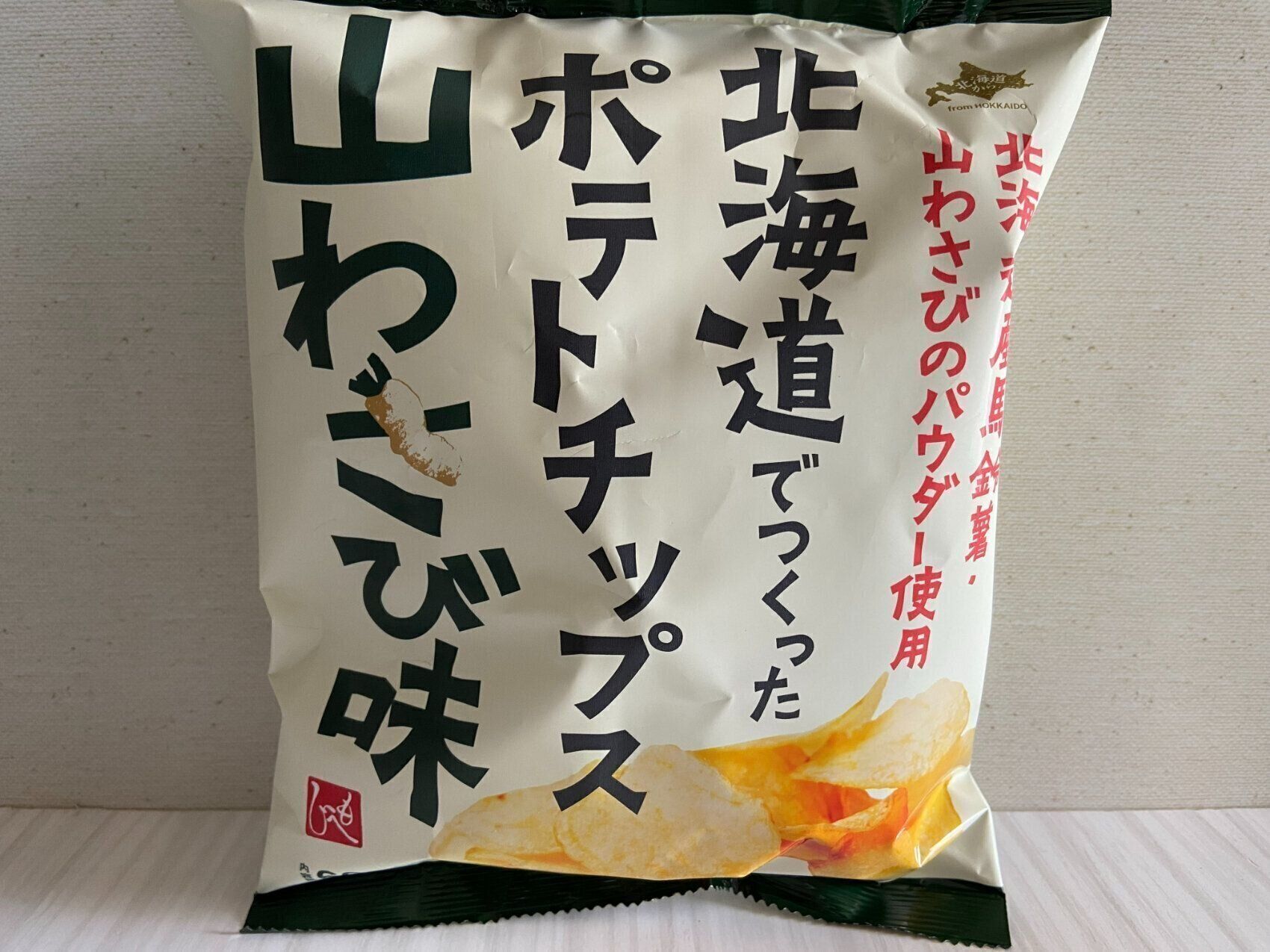 「北海道でつくったポテトチップス山わさび味」(購入時:224円)です。カルディではわさび味のスナックは今までいろいろ販売されていますが、山わさびは珍しいですね。
