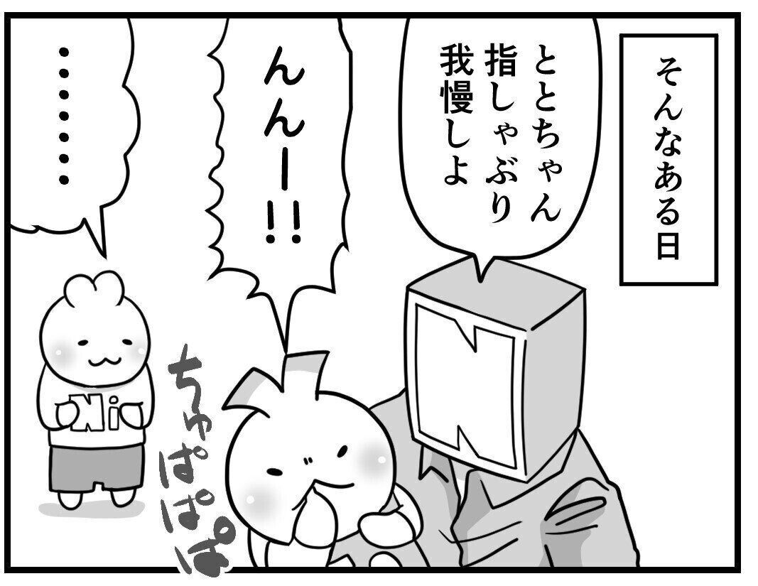 パパ頭さんが「ととちゃん指しゃぶり我慢しよ」と声を掛けても、ととちゃんは「んんー!!」と強く拒否。