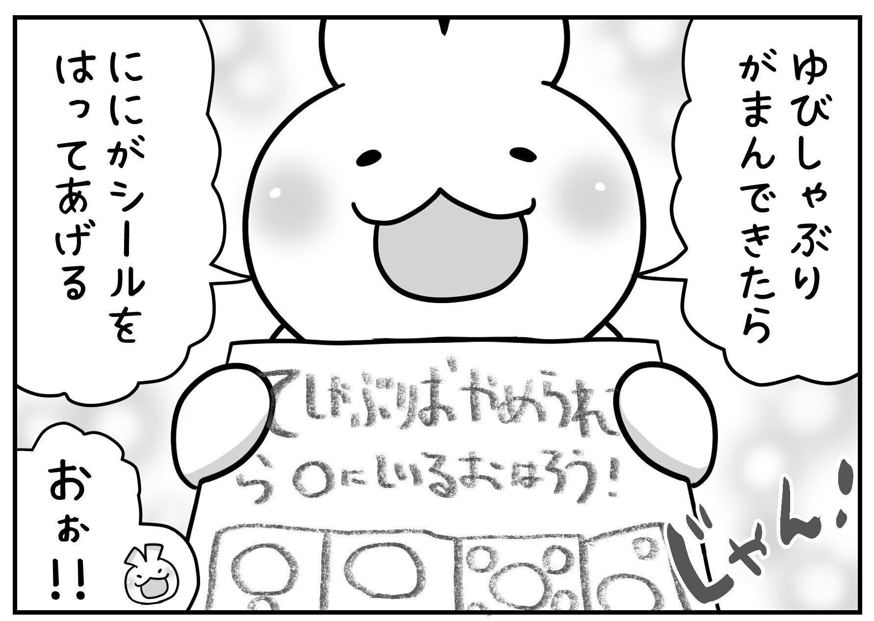 「いっしょにがんばろ」というににくんのお兄ちゃんらしい振る舞いに、ととちゃんも「いえ~い」とうれしそうです。ついさっきまで、指しゃぶりが我慢できない!と拒否の姿勢を示していたのに……お兄ちゃんの励ましは効果抜群!