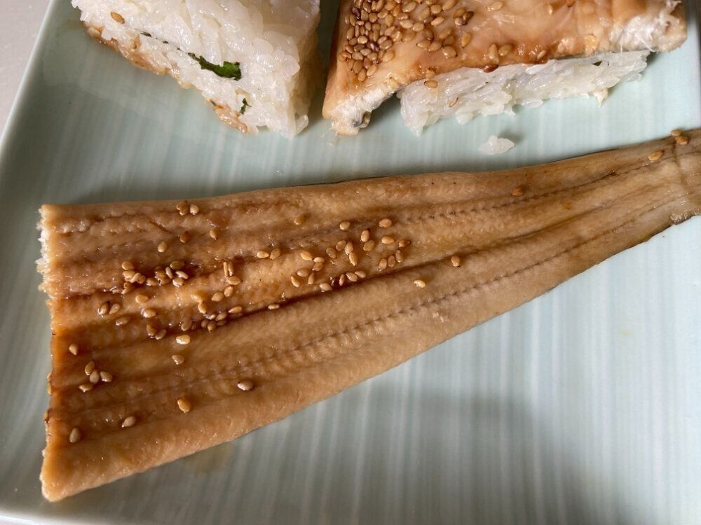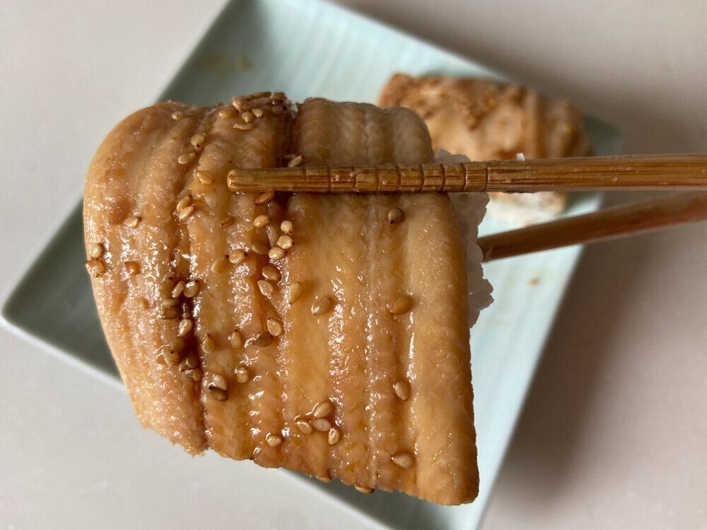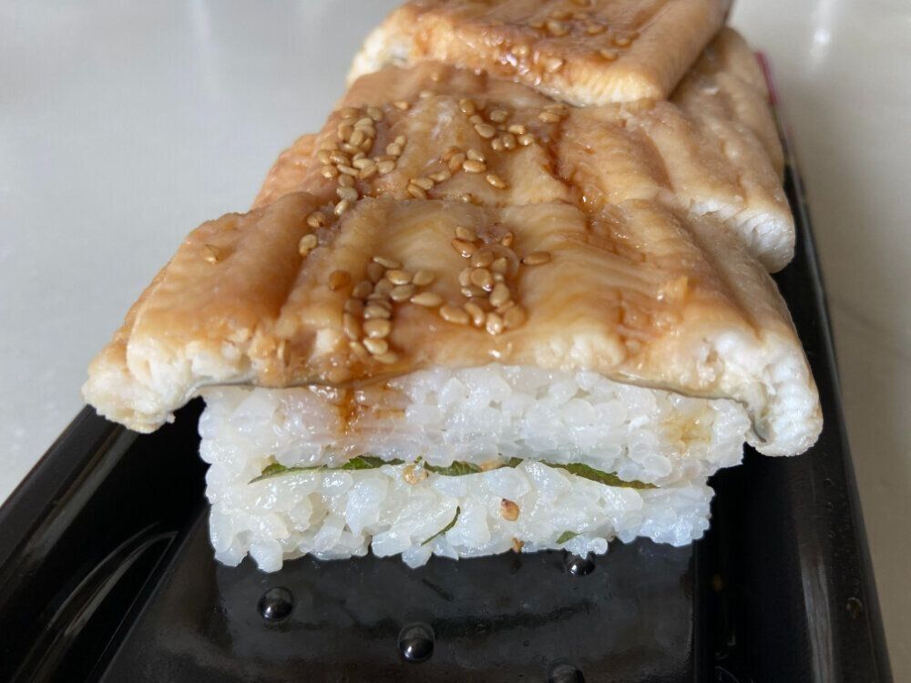 食べてみると、穴子のふっくら柔らかい食感と甘辛いタレが絶妙。酢飯の間にサンドされた大葉がまたいいアクセントになり、少しさっぱりとした口当たりになるのもうれしいですね。