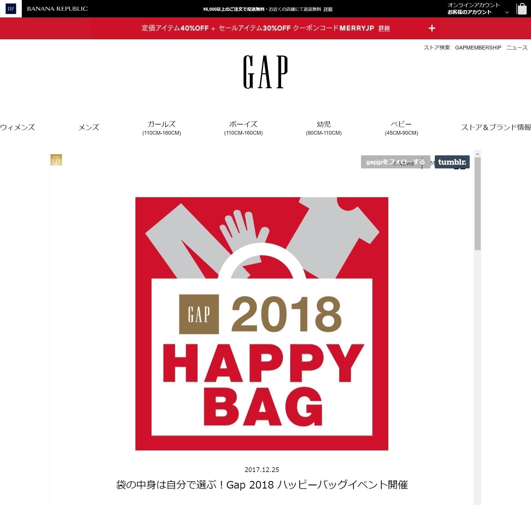 福袋の醍醐味と言えば、中身をチェックしたときの一喜一憂。でも、できれば“憂”は避けたいものですよね。GAPでは1月1日または2日の1日限定で、対象商品の中からお好きな5点をチョイスできる「Gap 2018 ハッピーバッグイベント」を実施。これならハズレなしの福袋が手に入りますね。価格は10000円(税込)。