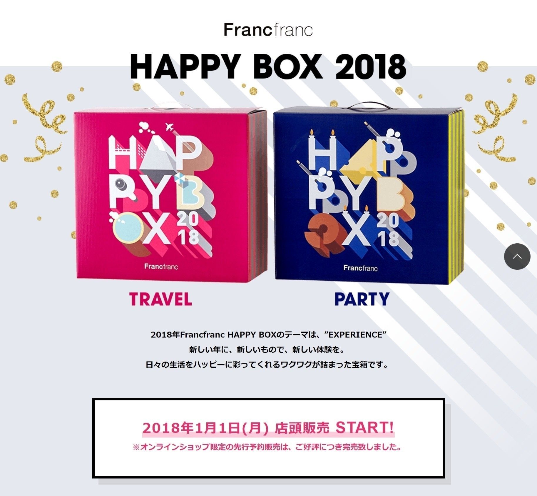 “EXPERIENCE”をテーマに掲げたフランフランの福袋「HAPPY BOX」は、“パーティー”と“トラベル”の2種を展開。価格はどちらも5000円(税込)となっています。HAPPY BOXには10分の1の確率で、フランフランで使える1000円オフクーポンHAPPY TICKETを封入。