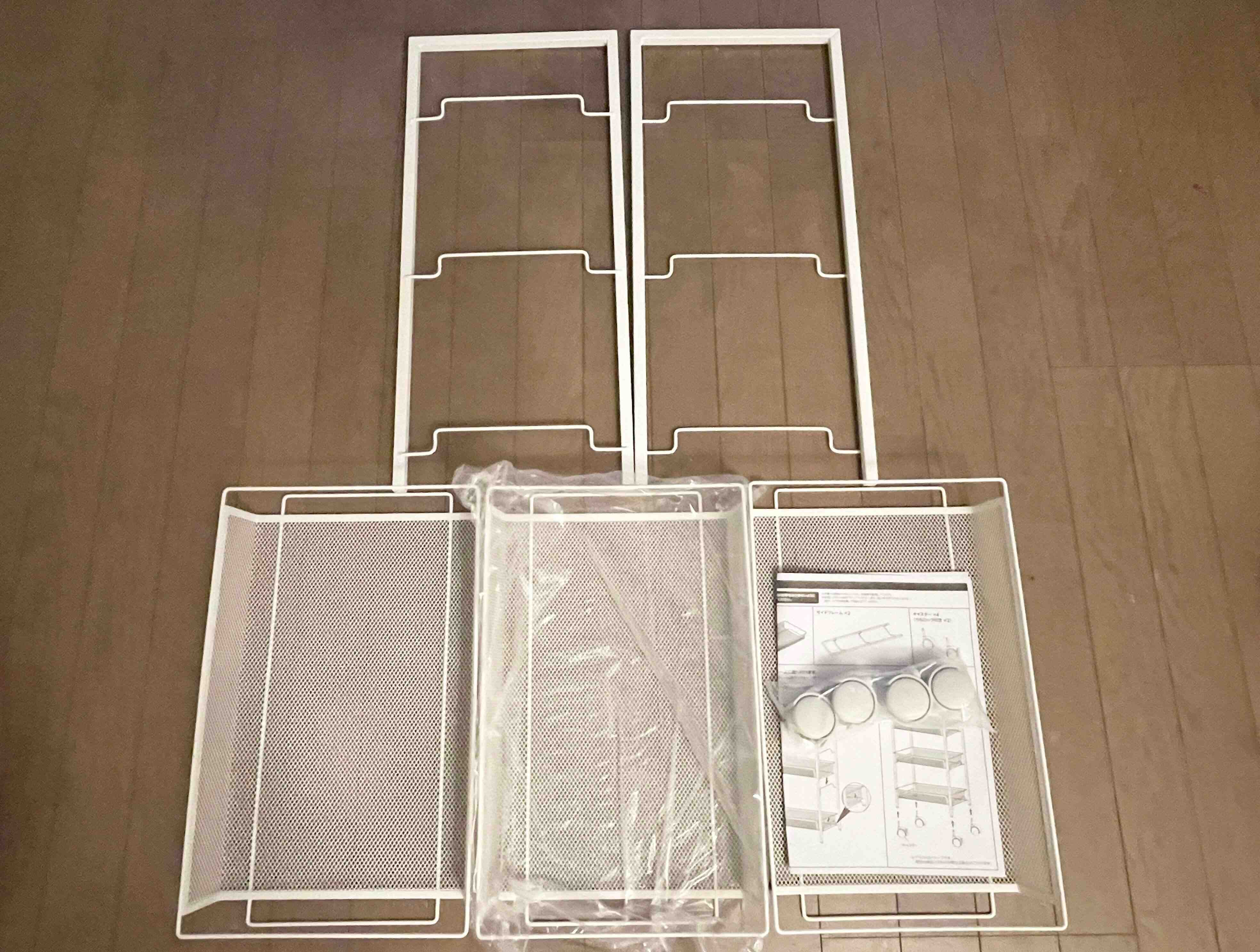 まず、パーツ自体がとても少なく、サイドのフレームとワイヤーネット、キャスターだけ。