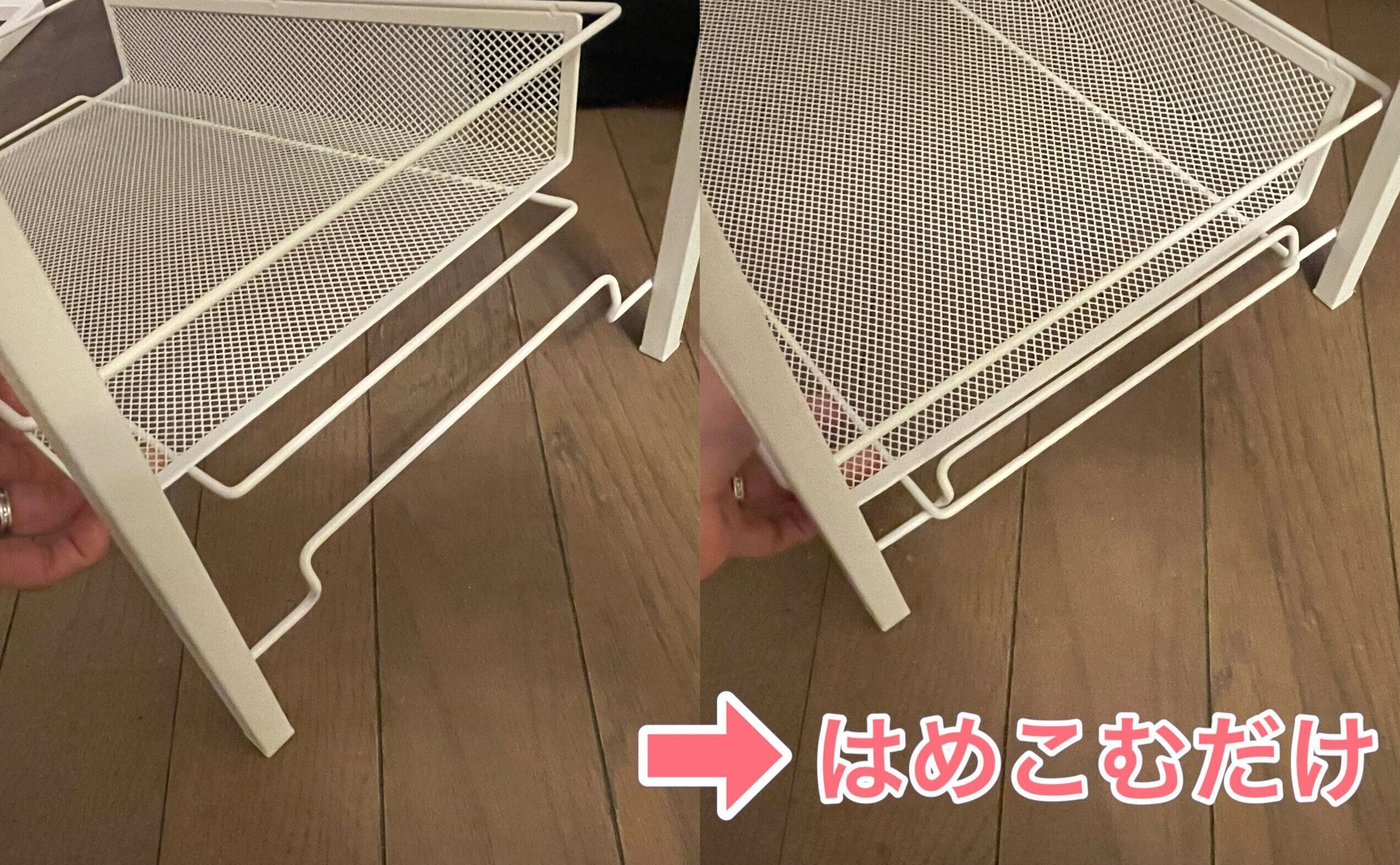 組み立て方は、サイドフレームの立ち上がり部分に、棚の横の出っ張りをはめこんでいくだけ。