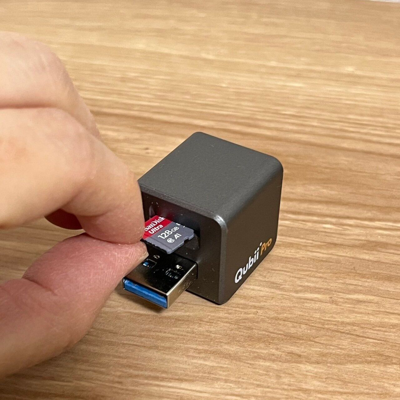 2. Qubii®にmicroSDカード(別売り)を差し込みます。