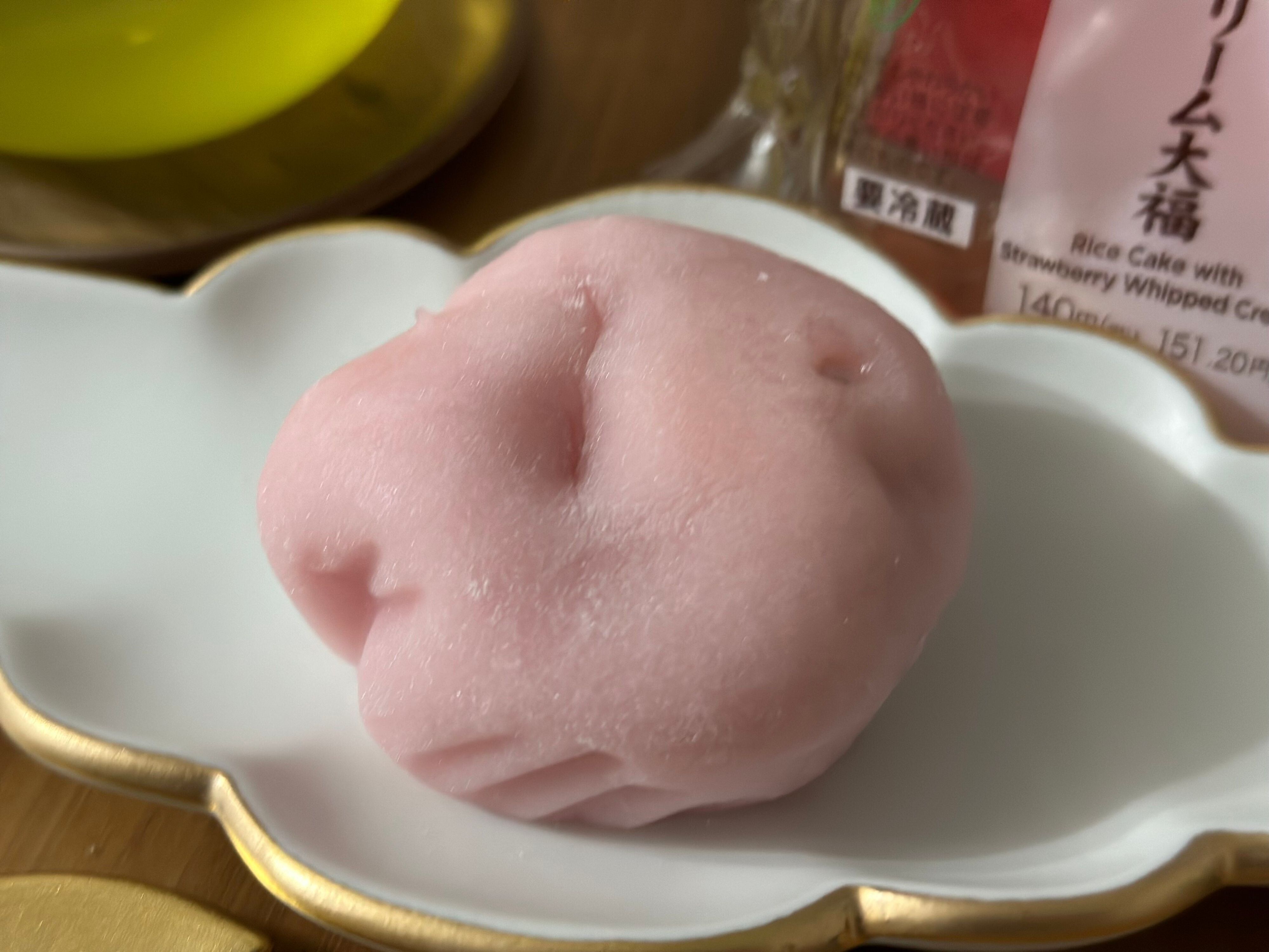 コロンとした手のひらサイズの大福。ほんのりピンク色がかわいらしいビジュアルです。