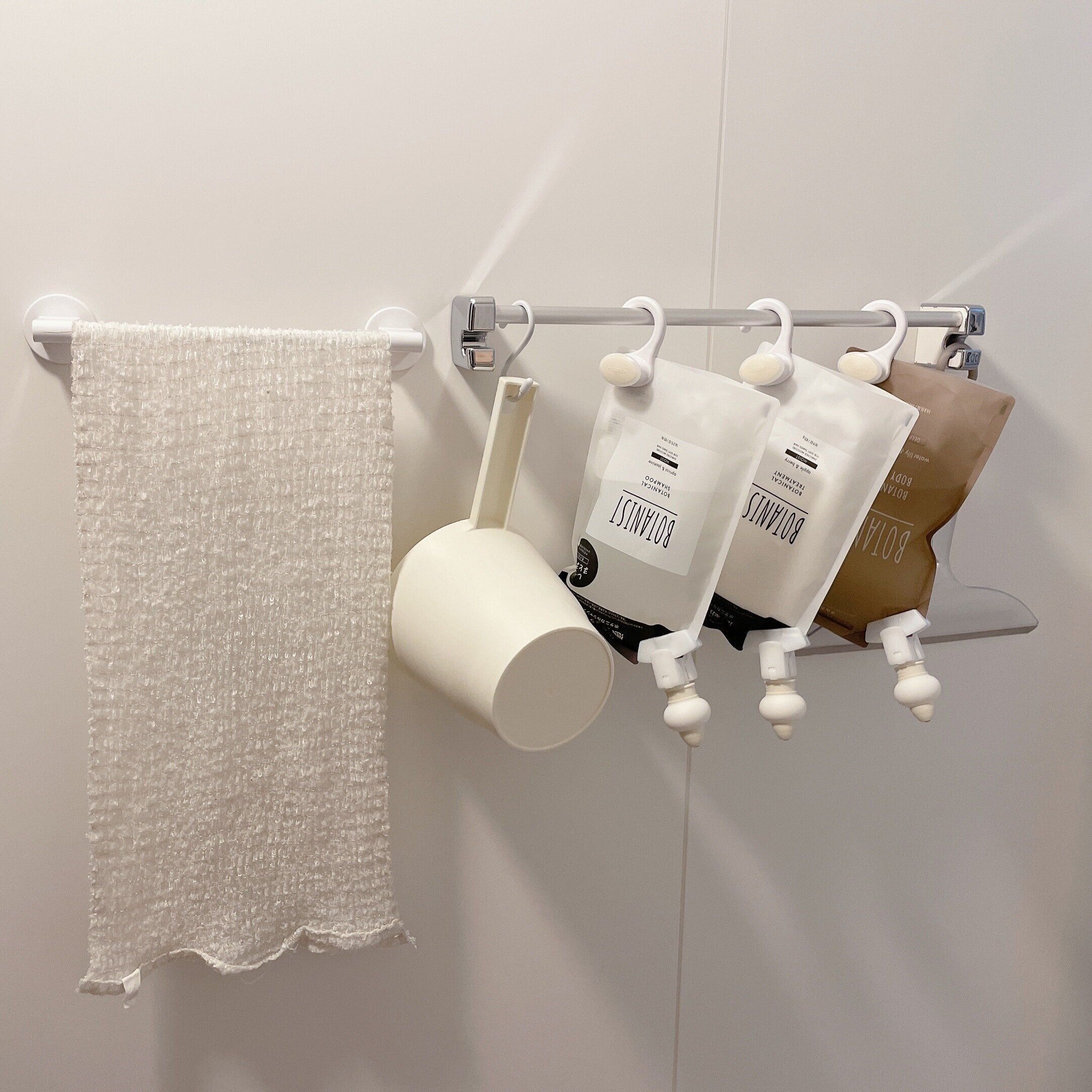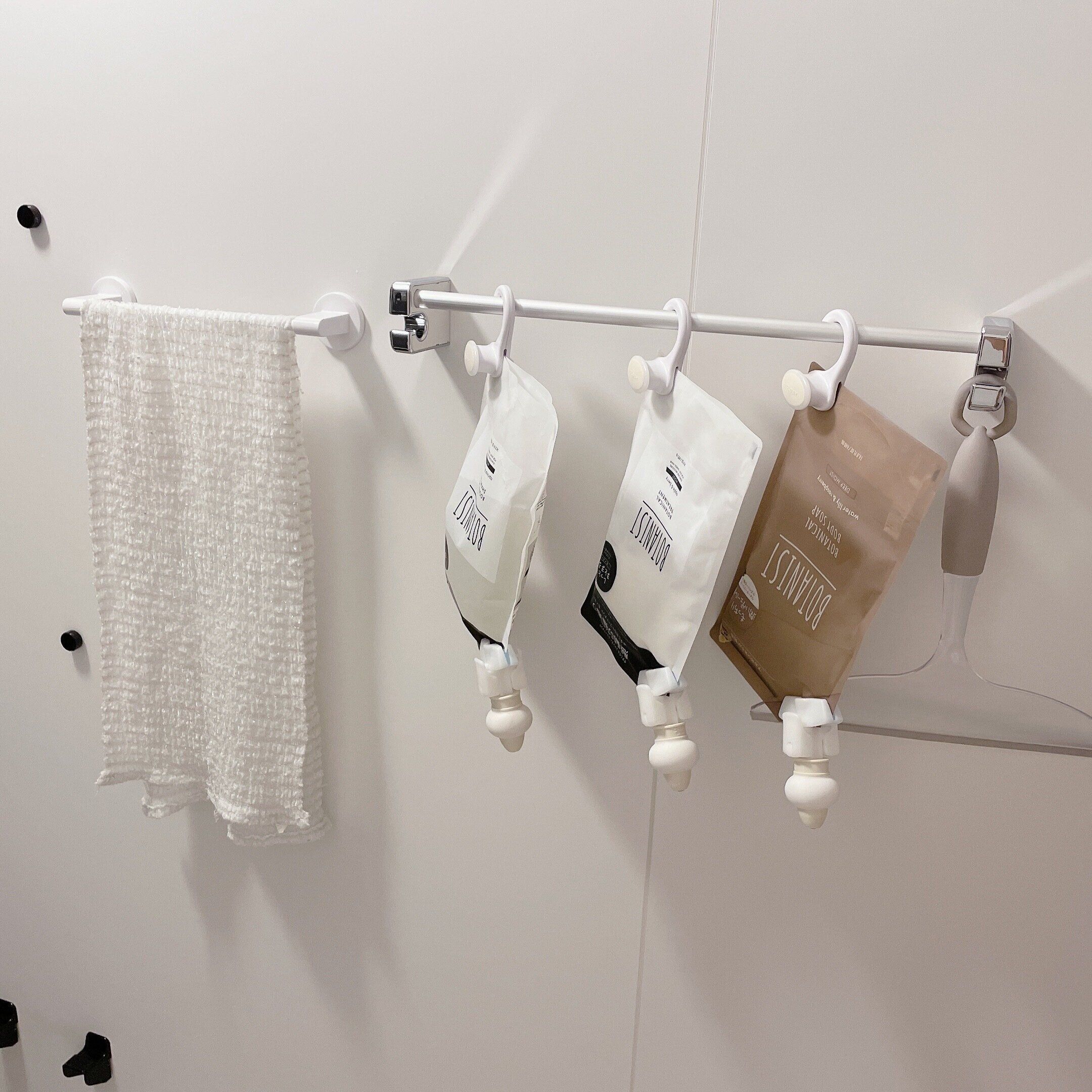 吊るして収納、使い切ったらパックを新しくしているのでボトルのぬめりやカビを気にしなくなりました。