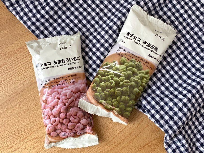無印良品で季節限定の「麦チョコ宇治玉露」と「麦チョコあまおういちご」を発見。