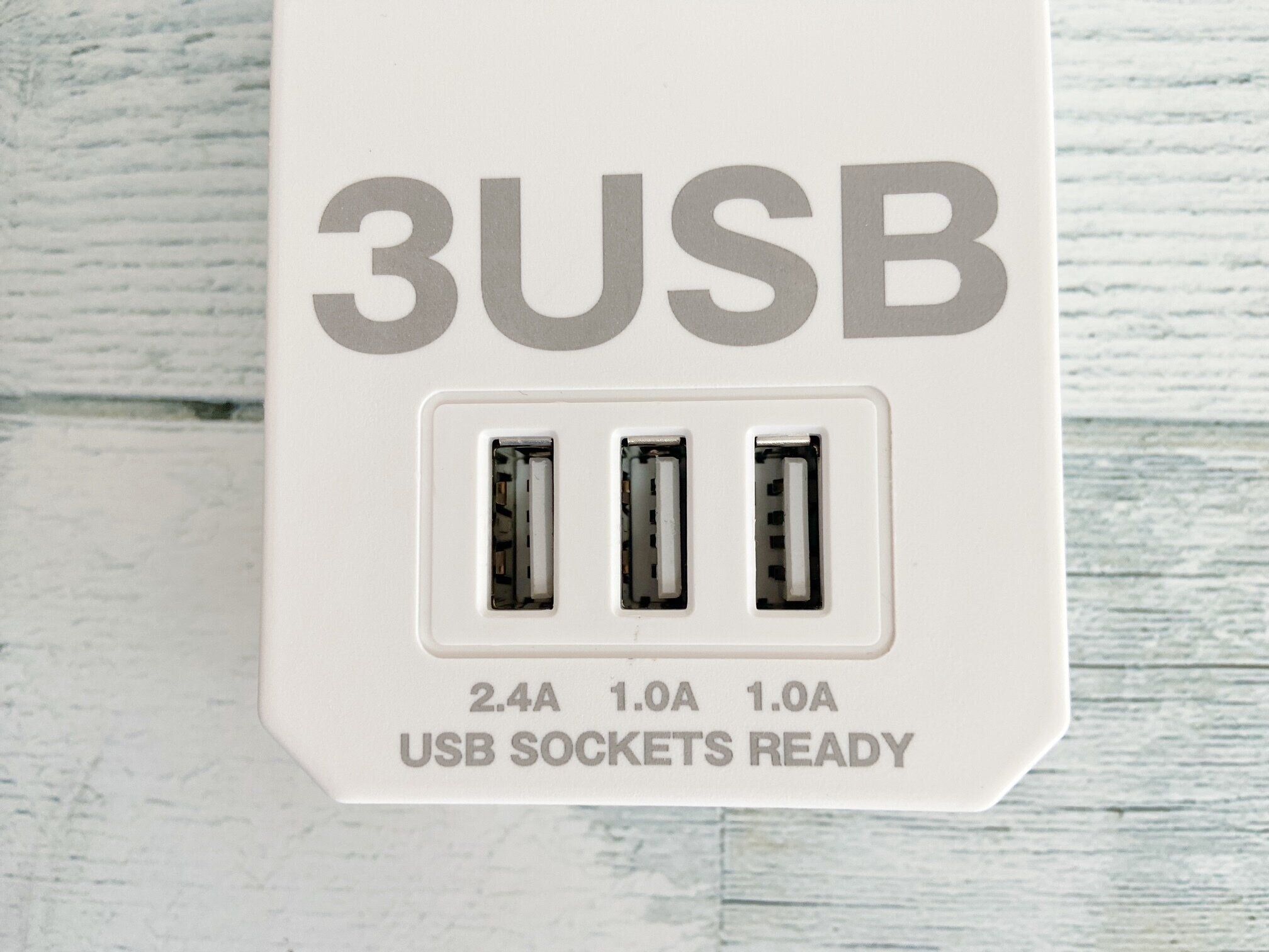 USBポートは2.4A・1.0Aが2個の計3個。家族のスマホやタブレットを同時に充電可能です。旅行もこの「2コンセント3USBタップ」一つ持っていけば他のUSBタップは持参しなくても家族みんなのスマホの充電が可能ですし、荷物を減らすことも出来ますね。旅行以外でも、コンセントまみれになっているお家の配線が「2コンセント3USBタップ」を使えばスッキリしますよ。
