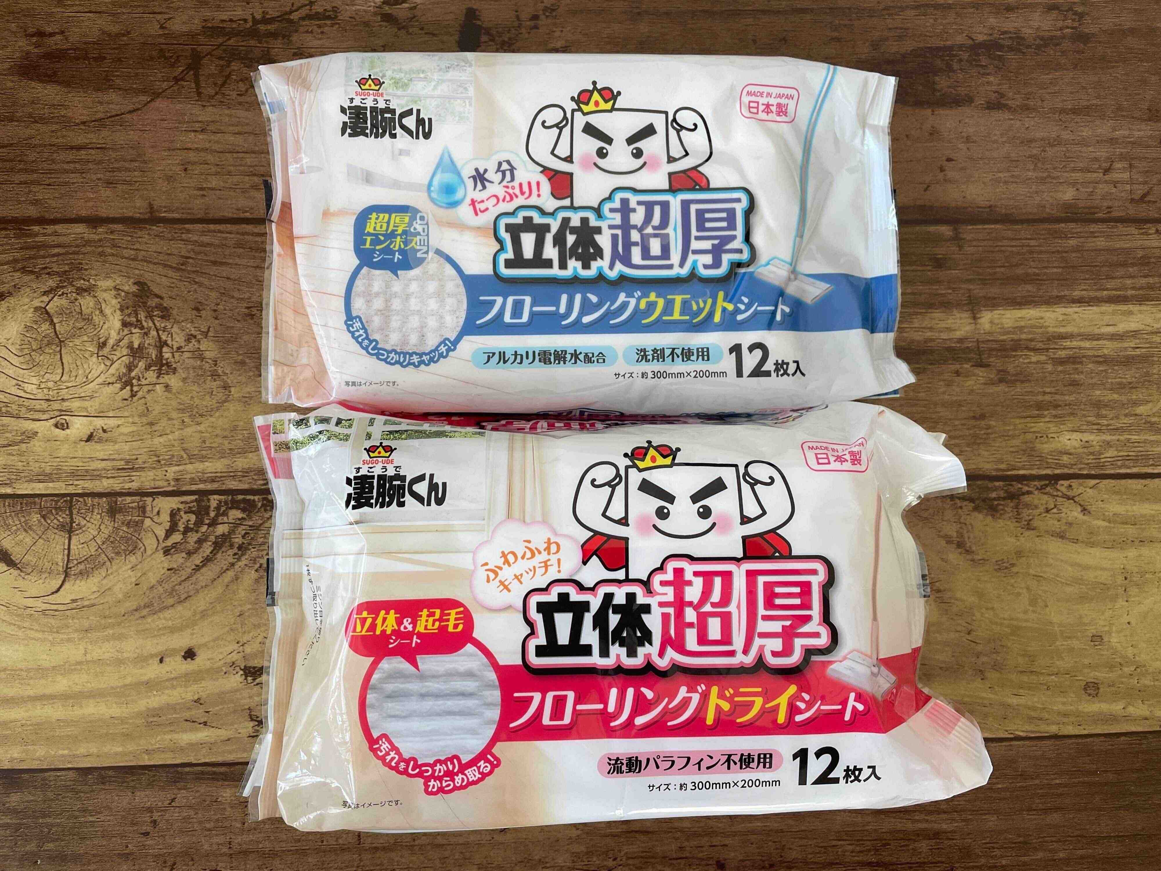 ご紹介するのは、ワッツの「立体超厚フローリングドライシート」と、「立体超厚フリーリングウエットシート」です。両方とも12枚入りで110円。