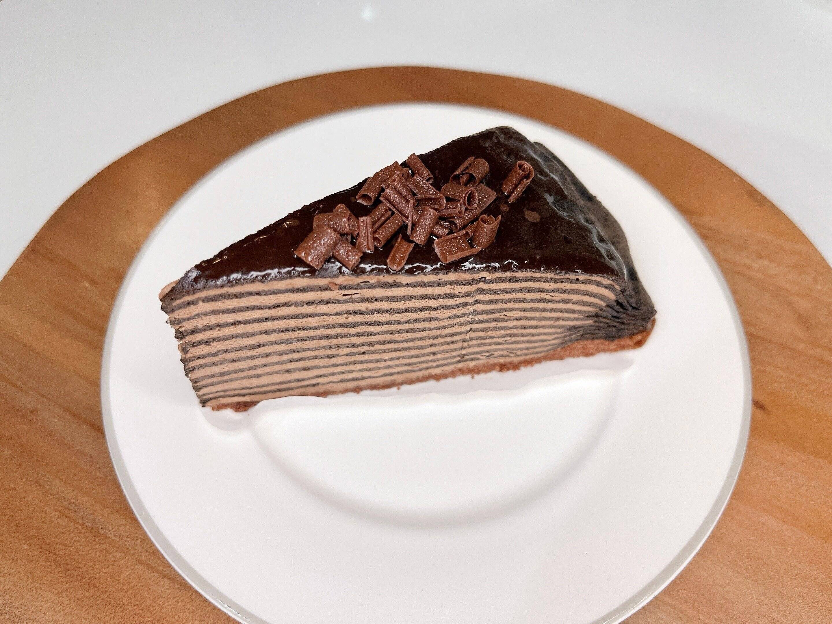 一番下の薄いココアスポンジの上にチョコクリームとココアクレープ生地が薄く交互に重なっています。