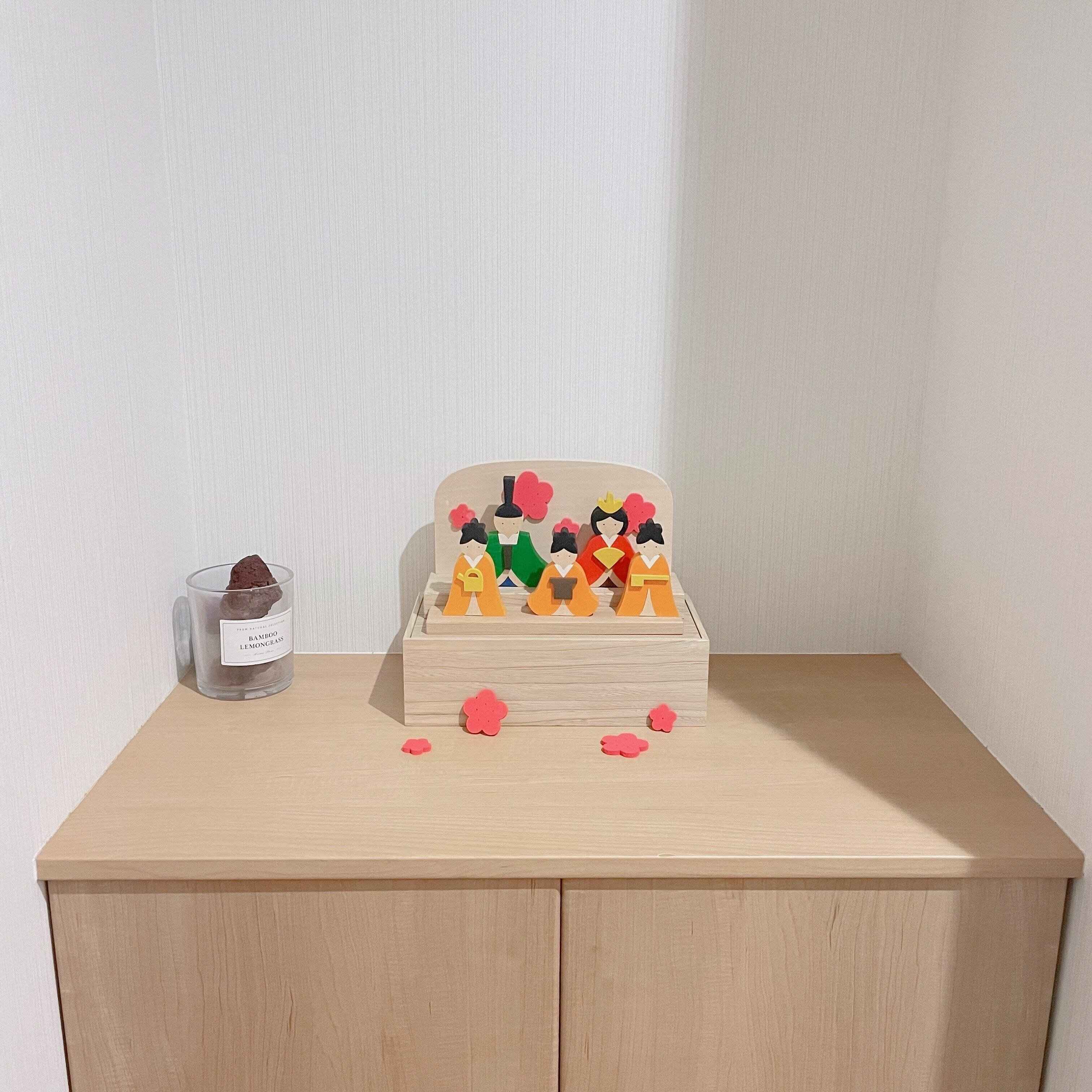 飾る時は、極力余計な物を置かないように意識していますが、少し寂しい印象になったので、ひな人形の雰囲気に合わせて、桜のタペストリーを追加予定です。