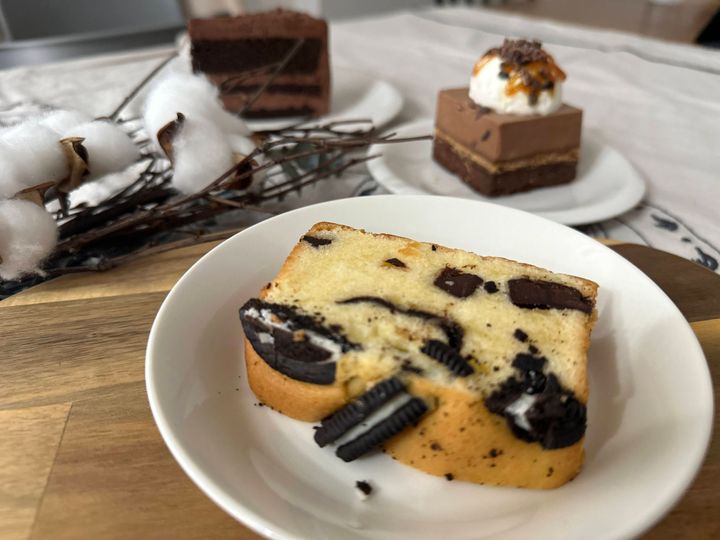 ココアクッキーが乗った、見た目にもわんぱくなパウンドケーキ。