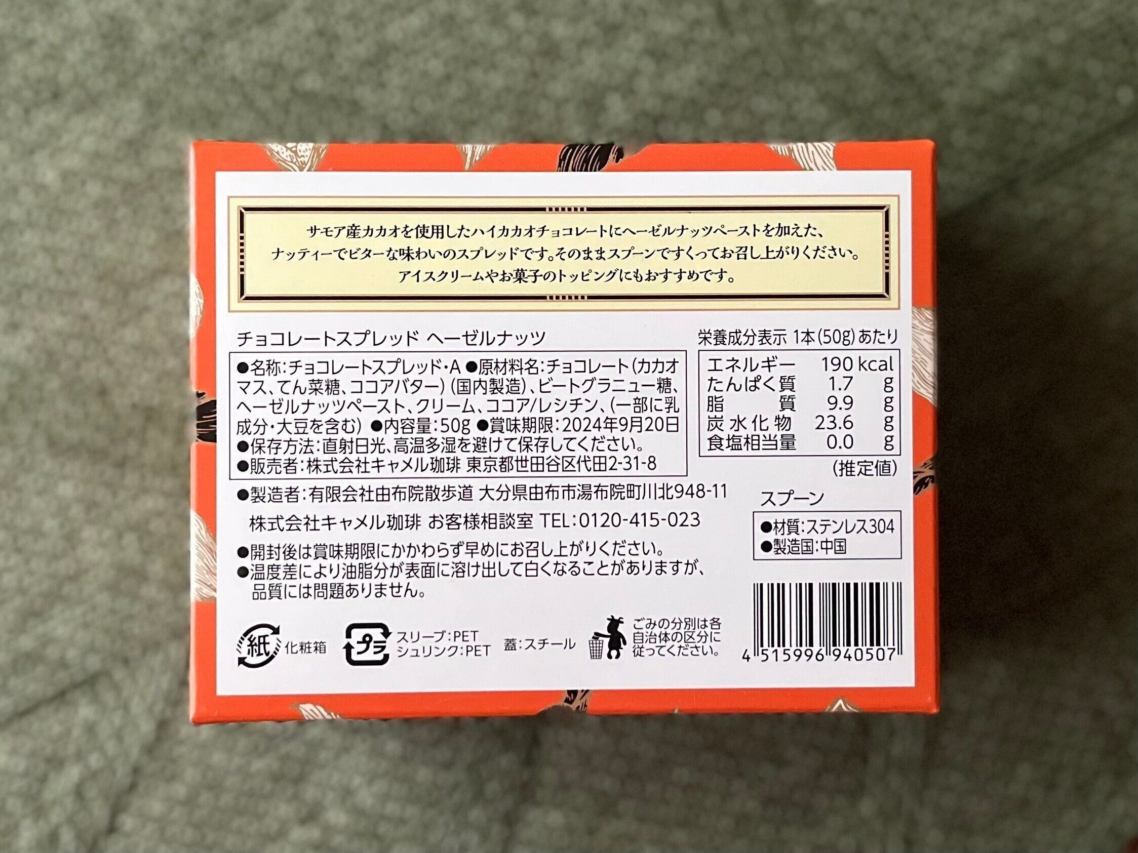 こちら、カルディの新商品「チョコレートスプレッド ヘーゼルナッツ」。オレンジ色のかわいらしいBOXが目印です。