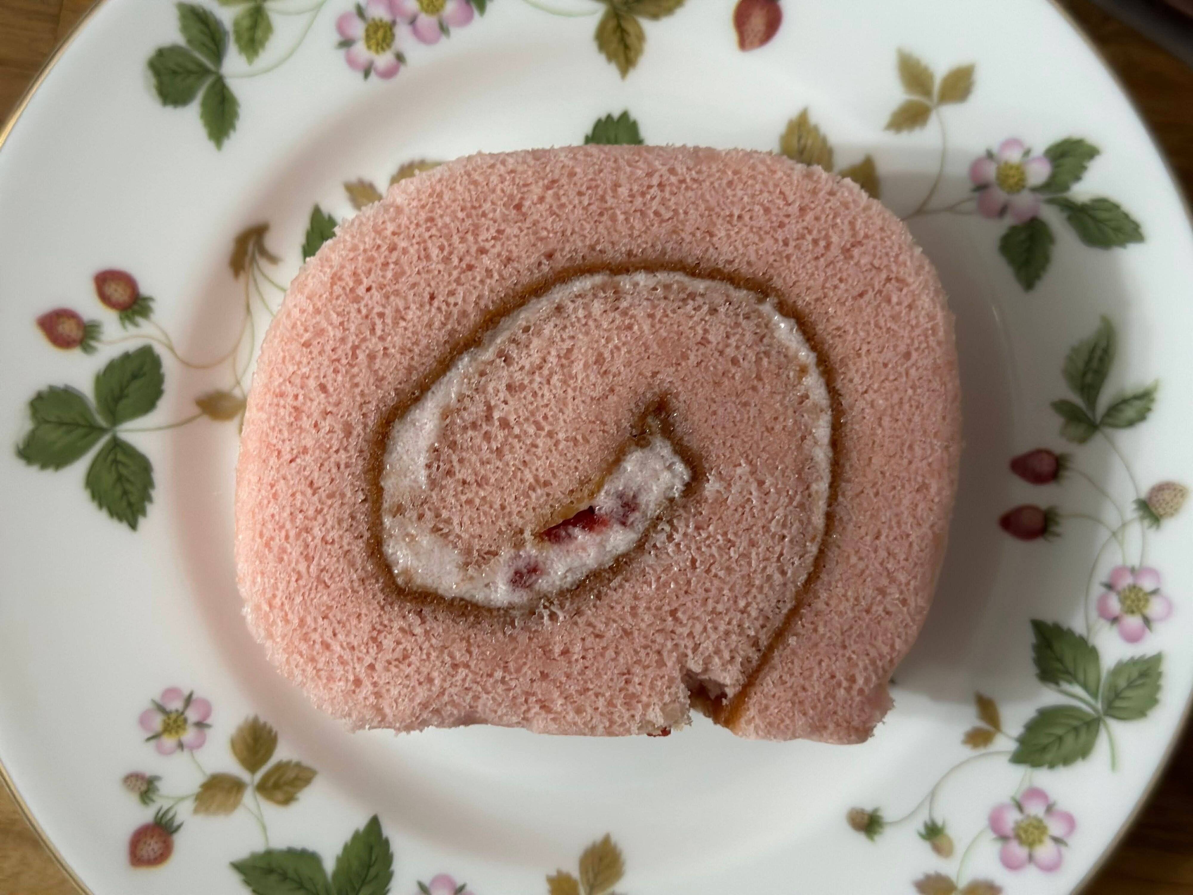 苺の風味がほんのり香るロールケーキ生地に、淡いピンク色がかわいい甘酸っぱい苺クリームはなめらかな口溶け。