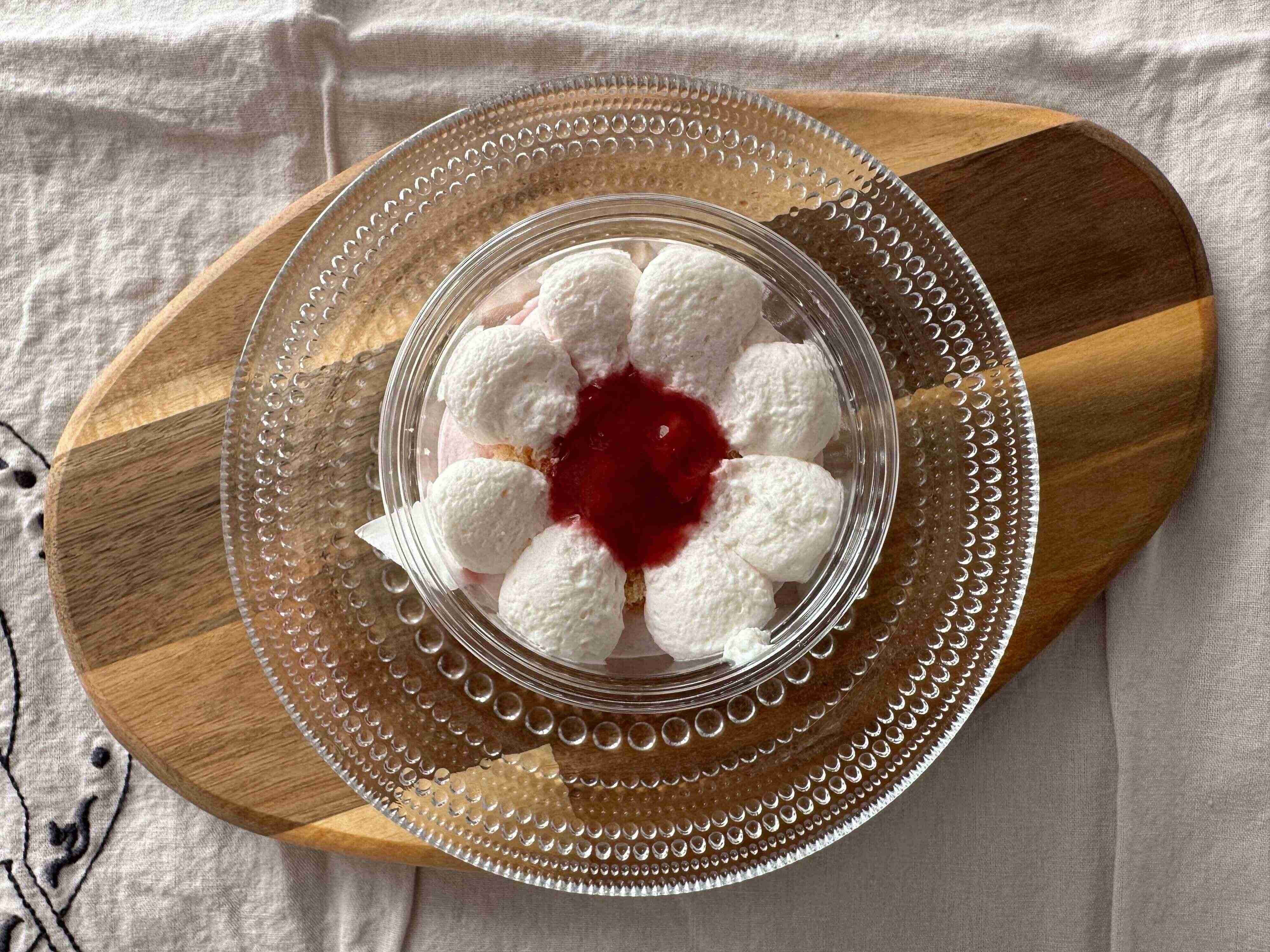 中央の苺ソースを囲むようにホイップがしぼられており、お花のような見た目がなんともかわいらしいビジュアル。
