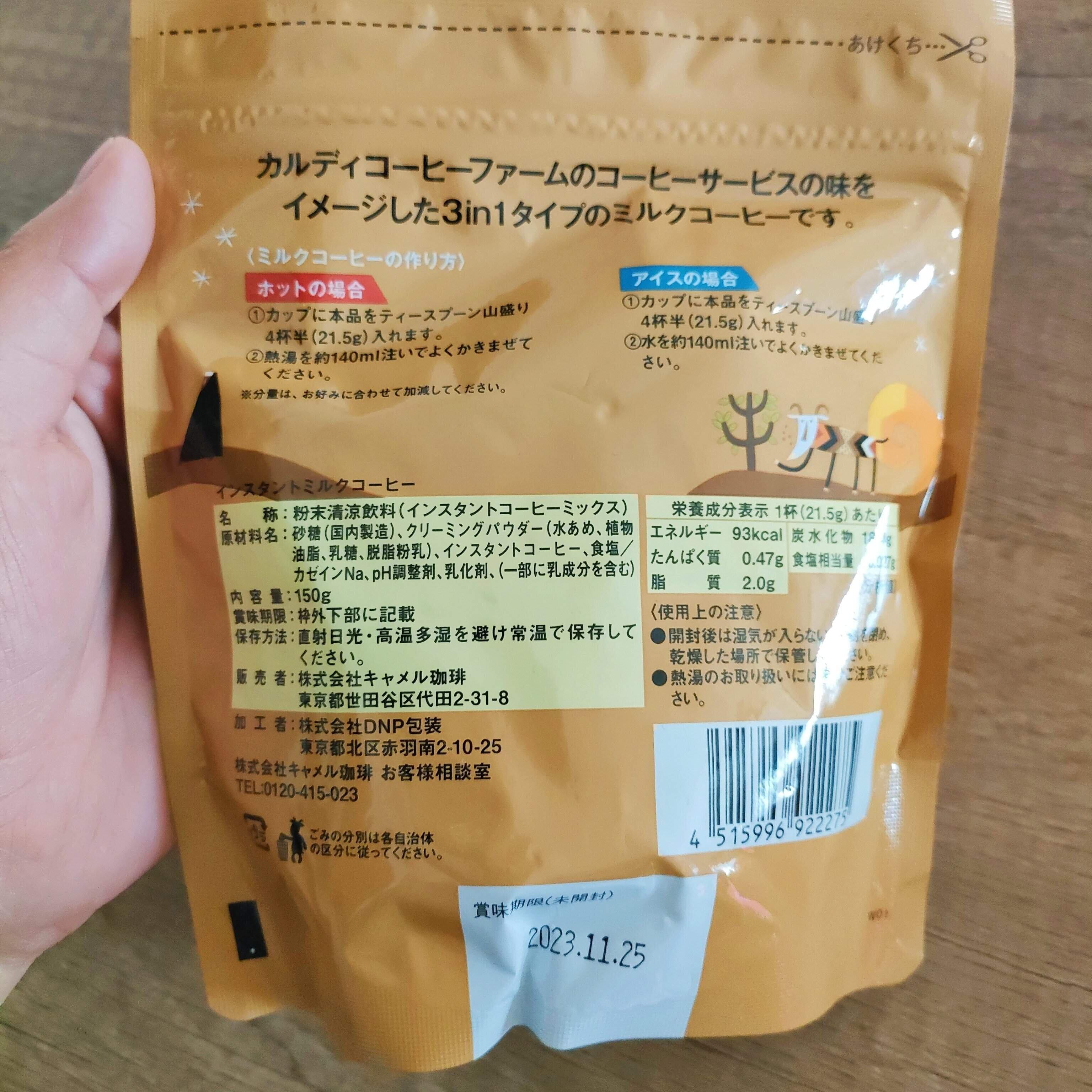 コーヒー、ミルク、お砂糖が全てバランスよく配合された3in1なので、カルディのあのコーヒーがすぐに味わえちゃうのです。