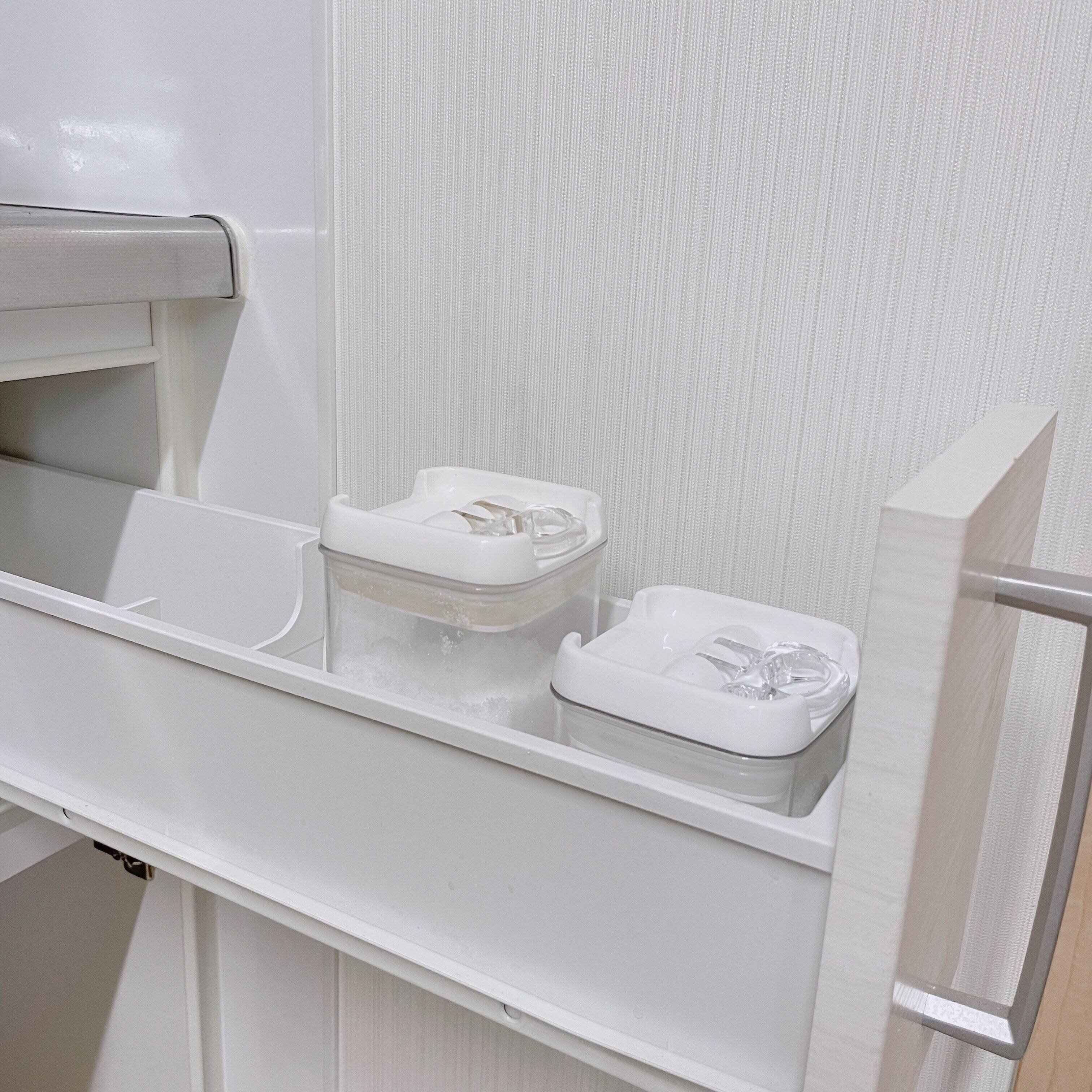 ガスコンロ側の小引出しにぴったりと収まり、高さ違いで容器を揃えているので取り間違えることもありません。