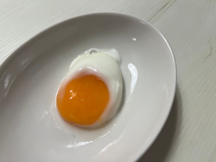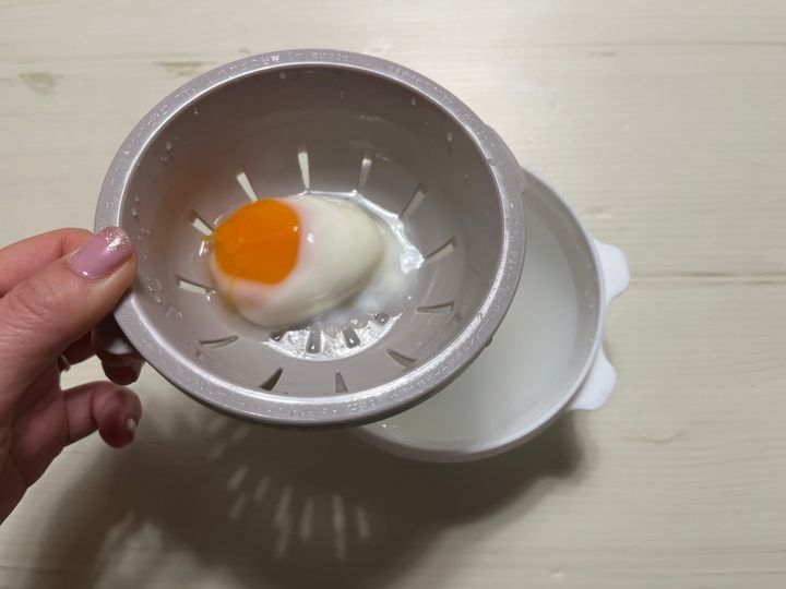 作り方通りに内側の線まで水を入れ、黄身にフォークで穴をあけ、1分20秒レンジ調理した半熟卵。