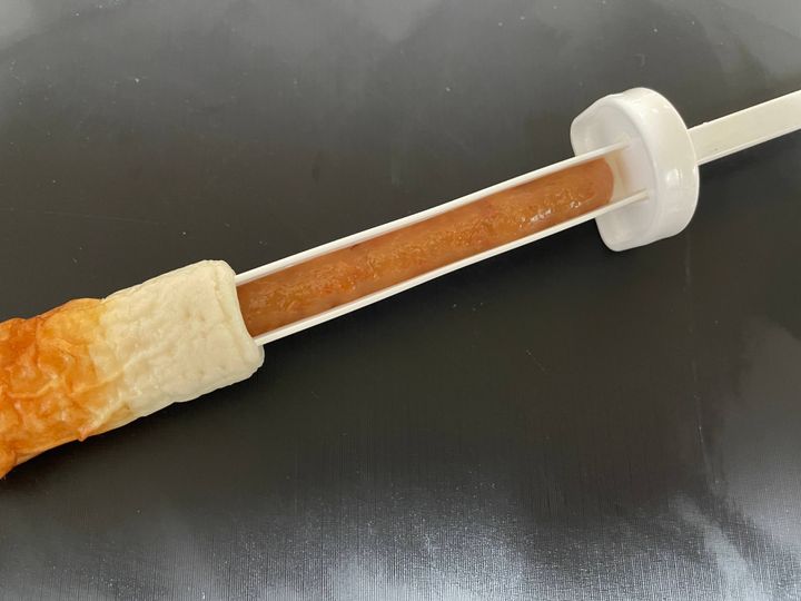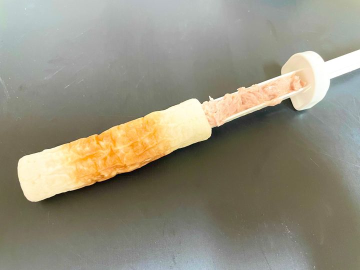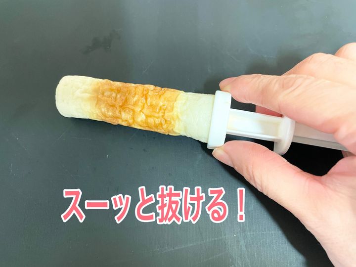 これを使うと、ちくわの穴がグイッと広がって、穴詰めがしやすい!ありそうでなかったアイテムですよね。