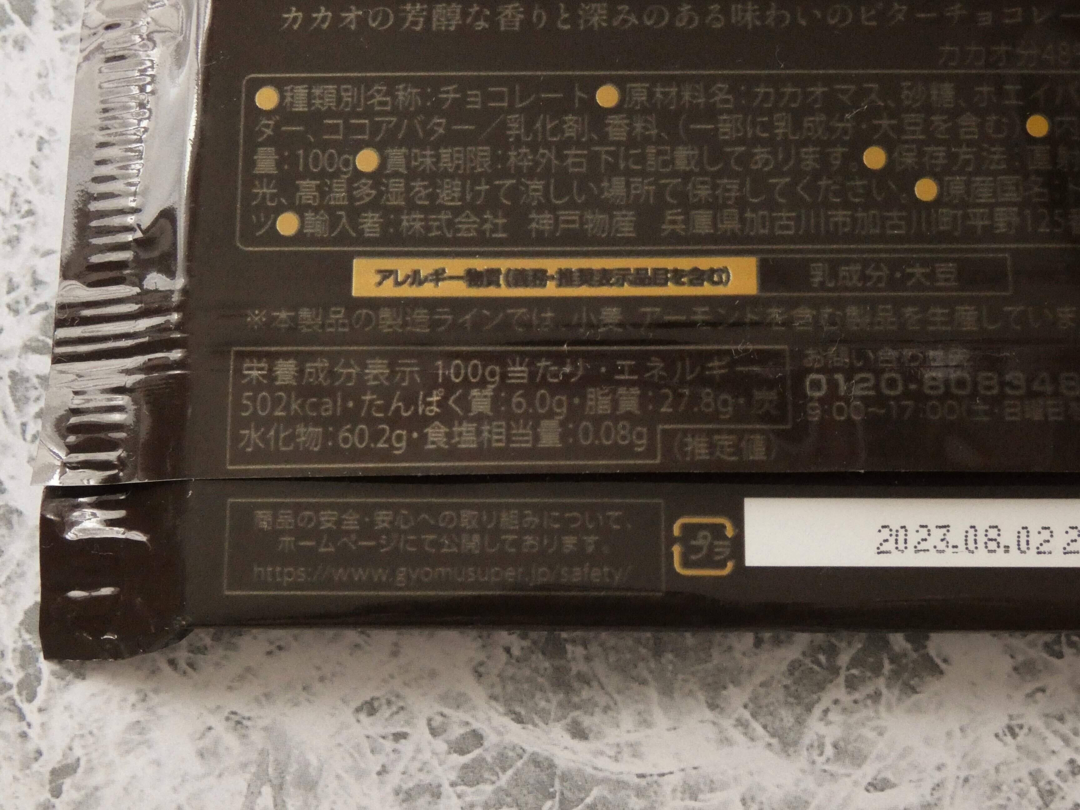 栄養成分表示を見ると、ビターチョコレート100gあたりのエネルギーは502kcal。