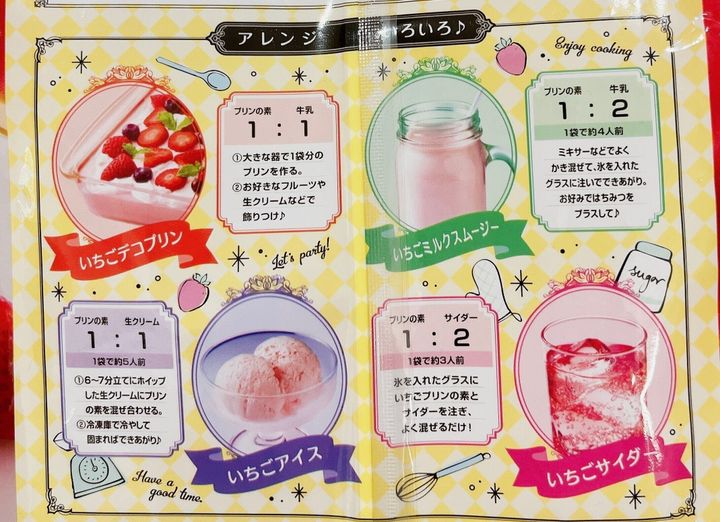 いちごミルクスムージー、いちごアイス、いちごサイダーなど、パッケージ裏面にはいろいろなアレンジ方法も記載れているのでぜひ試してみてくださいね!