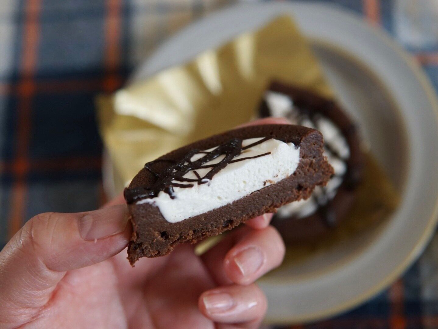 クリームの量は盛りすぎ版のほうが多いと感じました。あむっと口にするときに通常版だと周りがガトーショコラ中にクリームとなるのでガトーショコラの印象が強いのですが、こちらはクリームとガトーショコラを一緒に食べているという感覚になります。